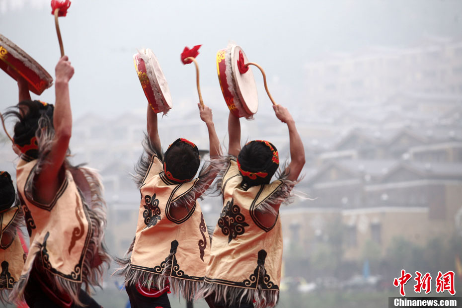 圖為汶川青年跳羊皮鼓舞歡慶羌?xì)v年。中新社發(fā) 張浪 攝