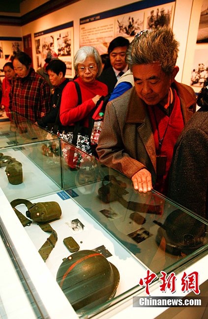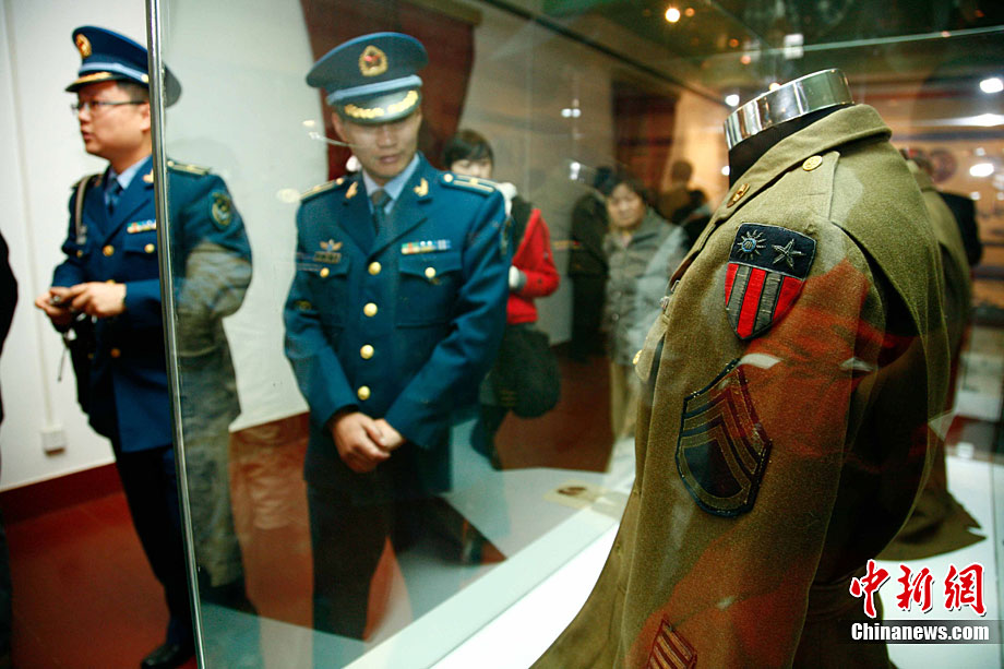 11月9日,由知名僑領(lǐng)陳燦培向昆明市捐贈的1100件飛虎隊文物在云南陸軍講武堂展出。創(chuàng)立于上個世紀40年代的飛虎隊,又稱中國空軍美國志愿援華航空隊。在抗日戰(zhàn)爭中對日作戰(zhàn),運送物資,戰(zhàn)果累累。圖為參觀展覽的空軍官兵。中新社記者 劉冉陽 攝
