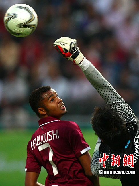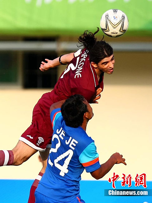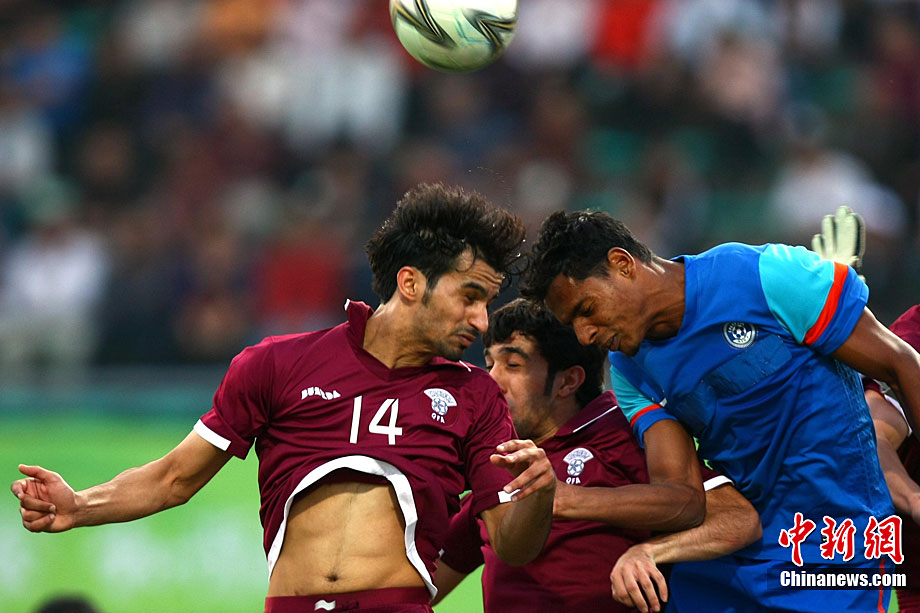 11月9日,第16屆亞運(yùn)會(huì)男足比賽展開D組的一場(chǎng)爭(zhēng)奪,上屆亞運(yùn)會(huì)冠軍卡塔爾隊(duì)(紅)在先失一球的情況下實(shí)現(xiàn)逆轉(zhuǎn),最終以2:1戰(zhàn)勝印度隊(duì)。中新社記者 富田 攝
