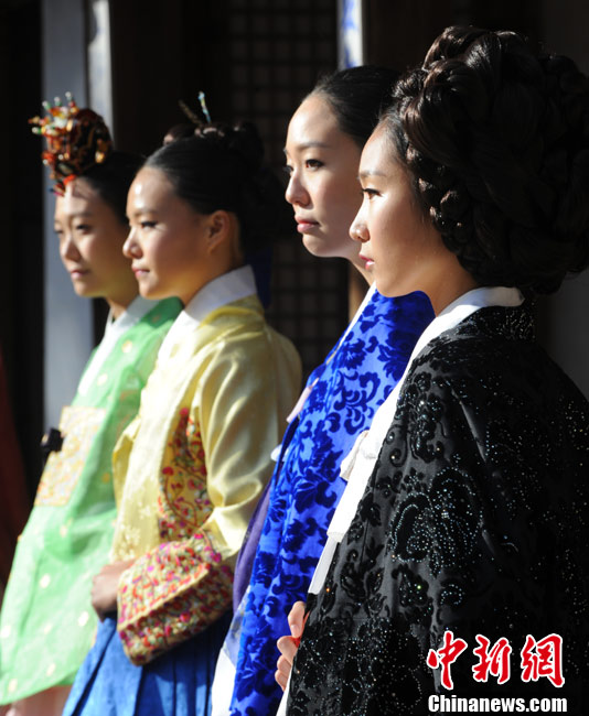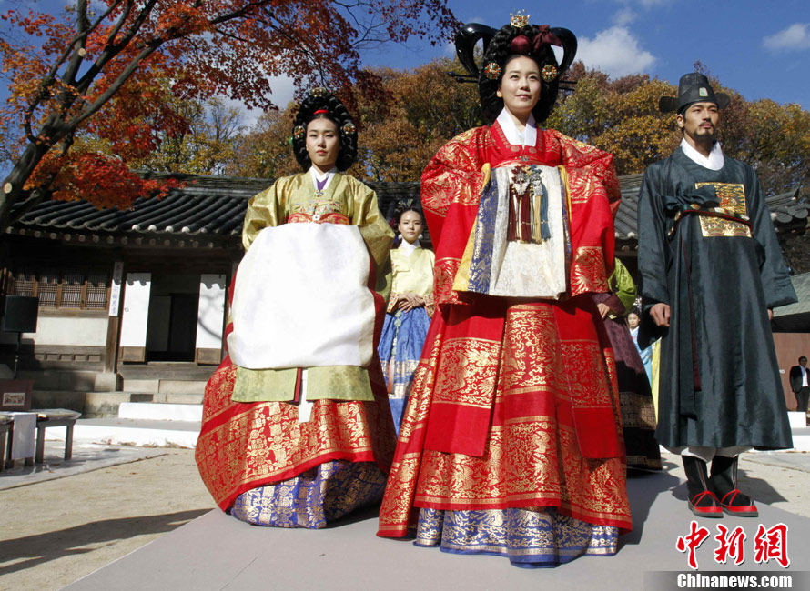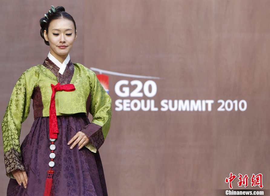 11月9日,韓國(guó)首爾昌德宮,模特進(jìn)行韓服服裝秀的排練。本次服裝秀是G20峰會(huì)期間的活動(dòng)之一。