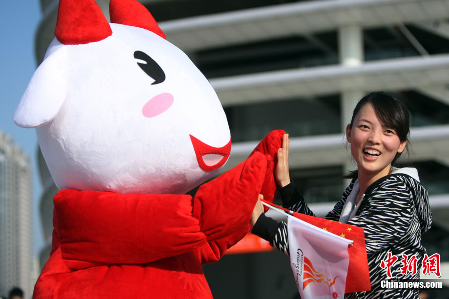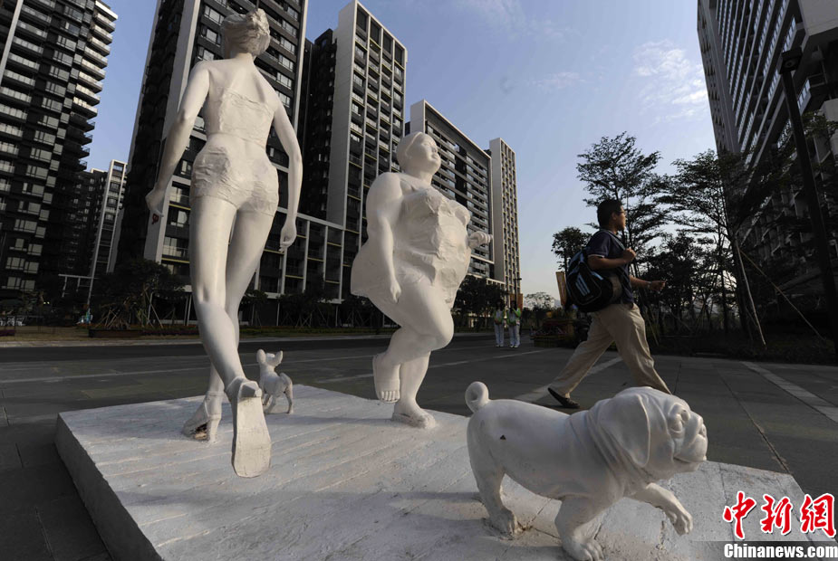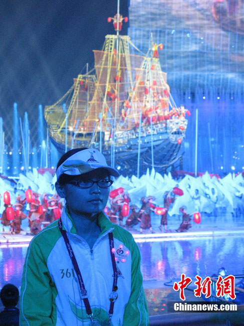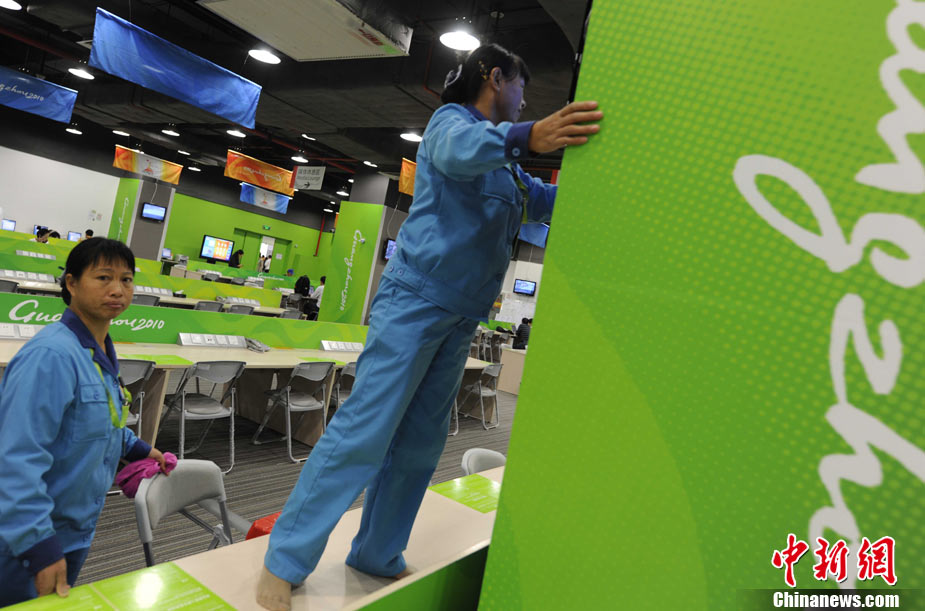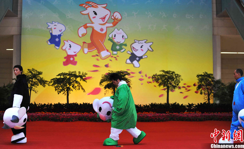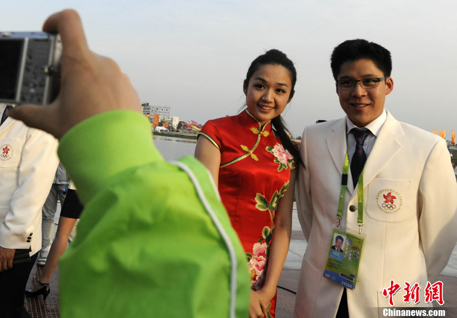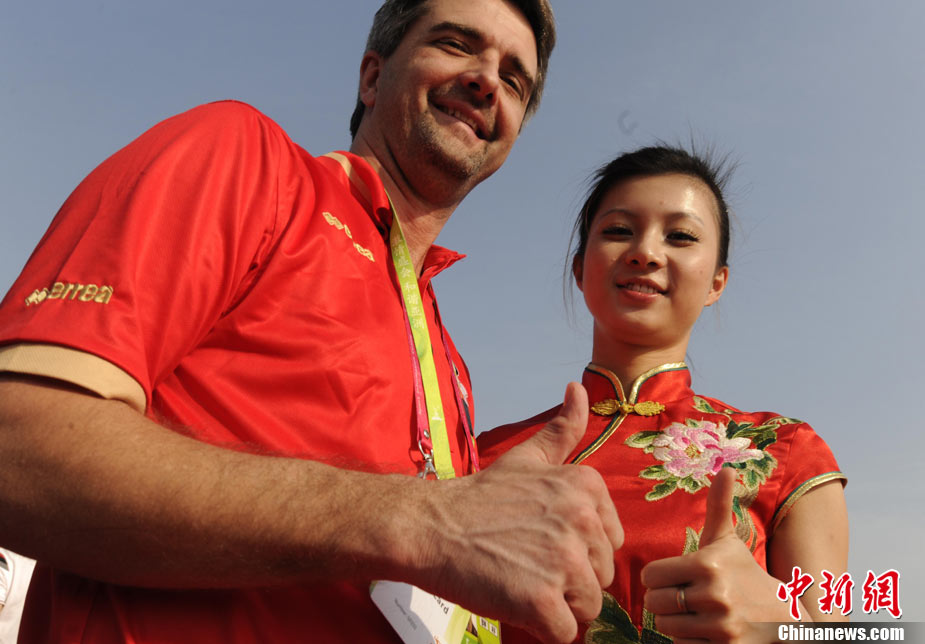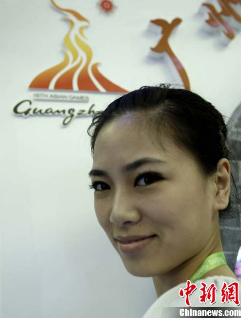 第十六屆亞運(yùn)會(huì)11月12日晚將在廣州開幕,中國香港代表團(tuán)副團(tuán)長霍啟剛在廣州亞運(yùn)村和禮儀小姐合影。