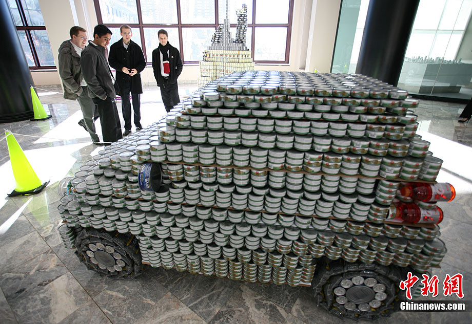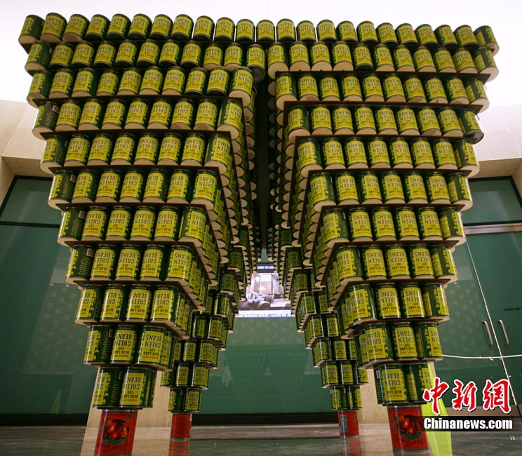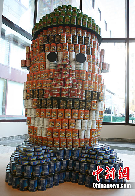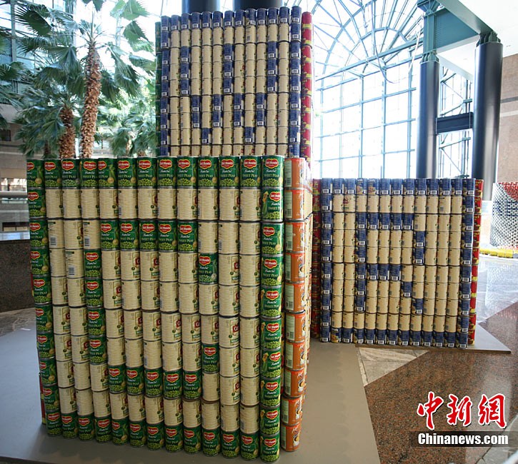 當(dāng)?shù)貢r(shí)間11月11日,美國(guó)紐約世界金融中心的冬園展出了一組用各種食品罐頭組合成的雕塑作品。此次展覽結(jié)束后,這些作品將被拆除,所有的罐頭都將被捐給慈善機(jī)構(gòu)“城市收獲”,用來援助仍在忍受饑餓的人。
