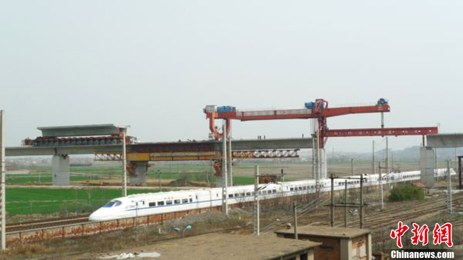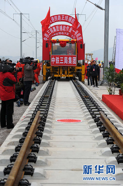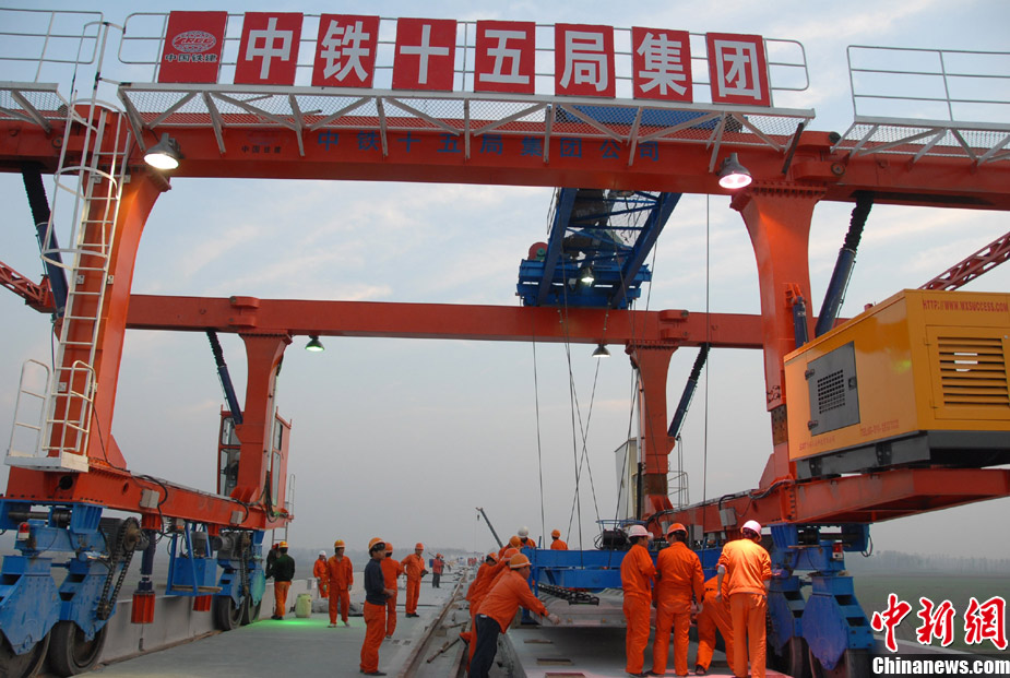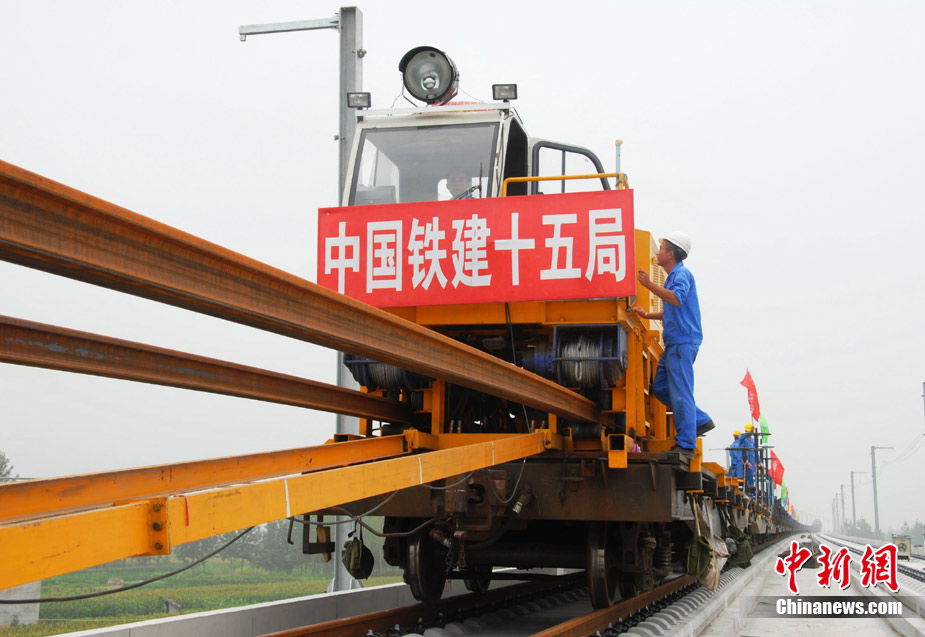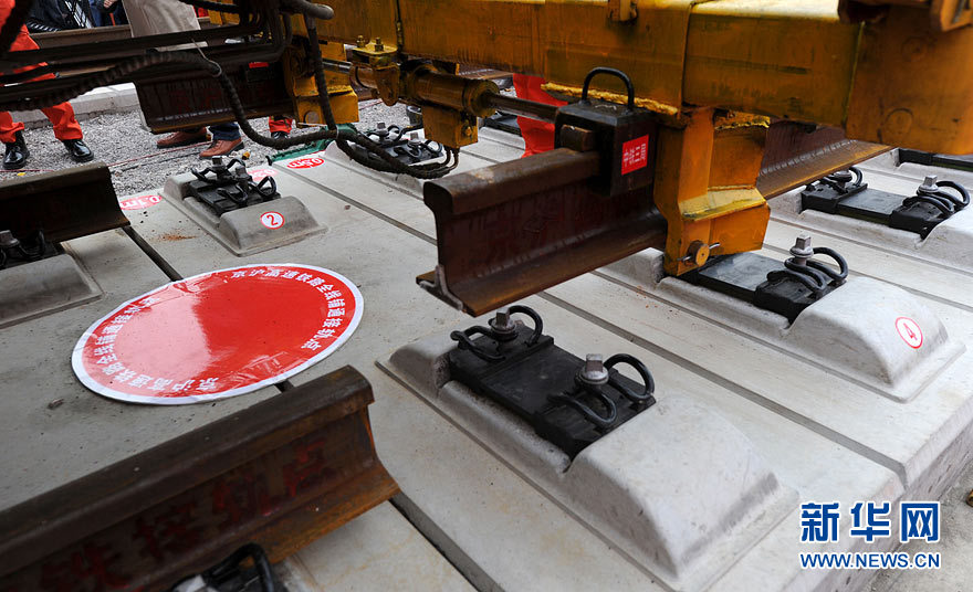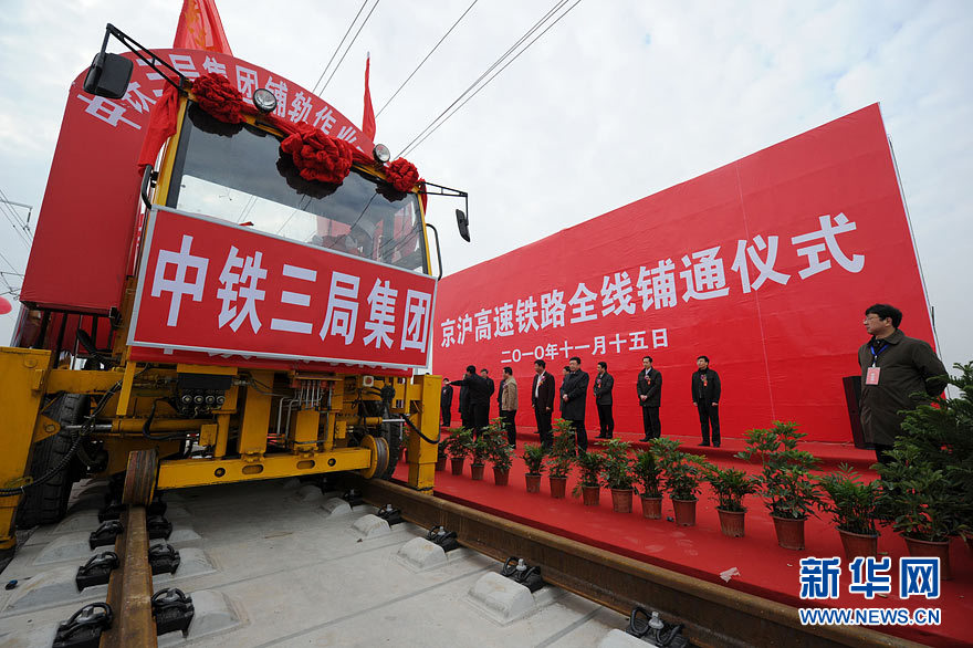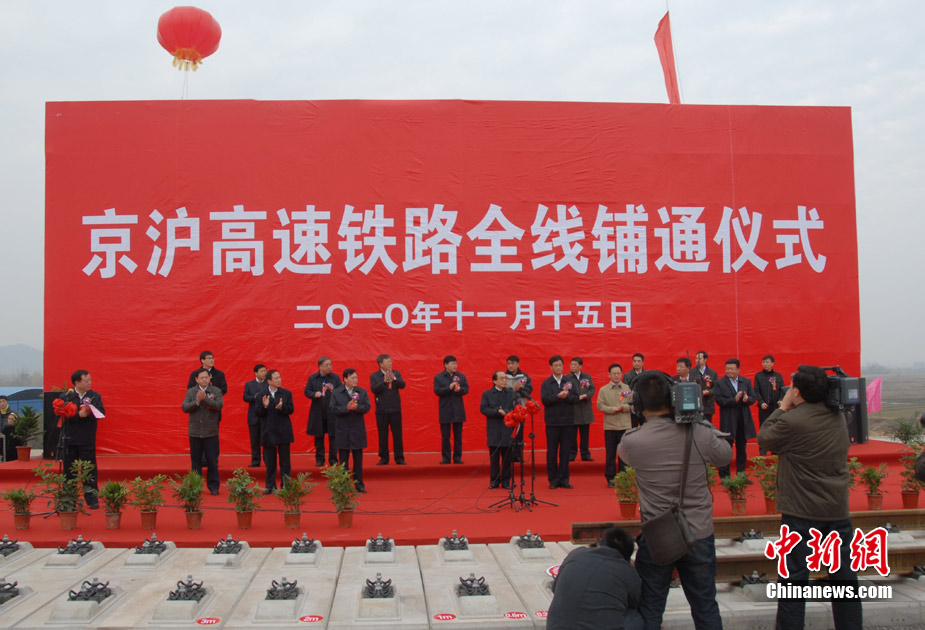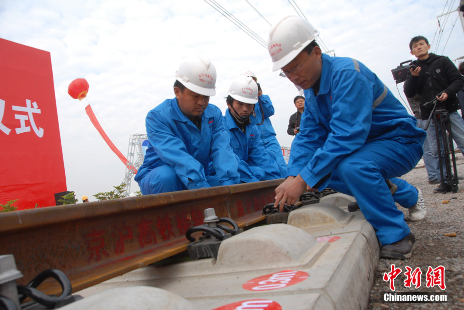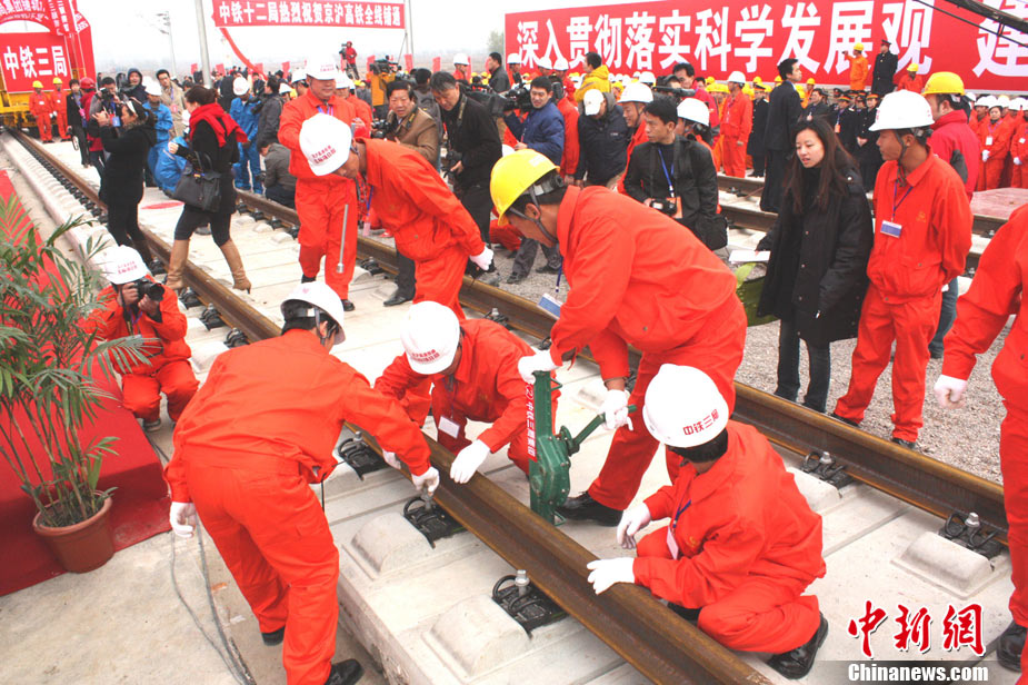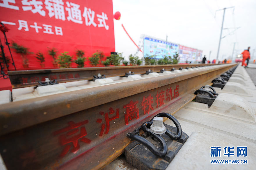 11月15日上午,隨著最后一根鐵軌在安徽蚌埠段順利鋪下,京滬高速鐵路全線完成鋪通工程,這是京滬高速鐵路建設(shè)取得的又一重大階段性成果。京滬高速鐵路的全線鋪通,標(biāo)志著以線下工程和鋪軌為主的站前工程全部結(jié)束,下一步將全力推進以牽引供電、通信、信號、電力“四電集成”施工和站房建設(shè)為主的站后工程施工,展開全線聯(lián)調(diào)聯(lián)試。圖為15日,京滬高鐵先導(dǎo)段鋪通儀式在京滬高鐵蚌埠南火車站舉行。中鐵十五局員工在接軌點安裝最后一組鋼軌鎖定螺栓。(張智海 范剛軍 李紅)