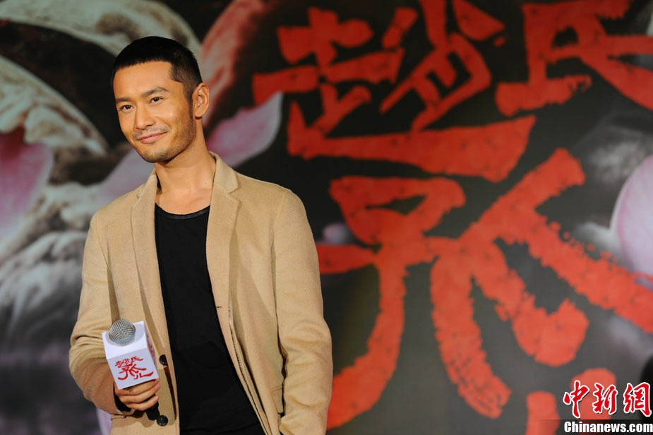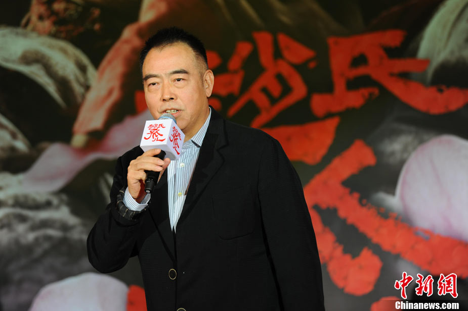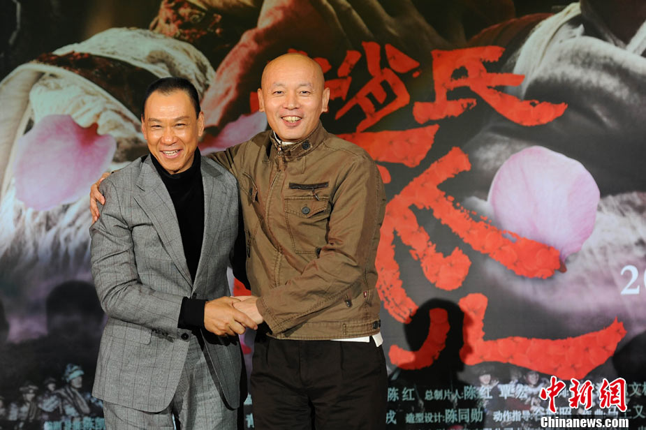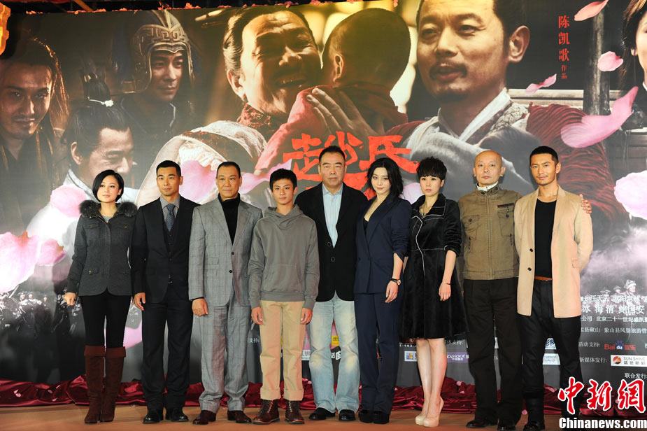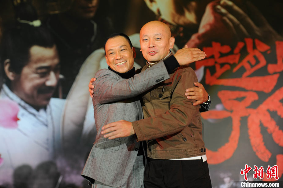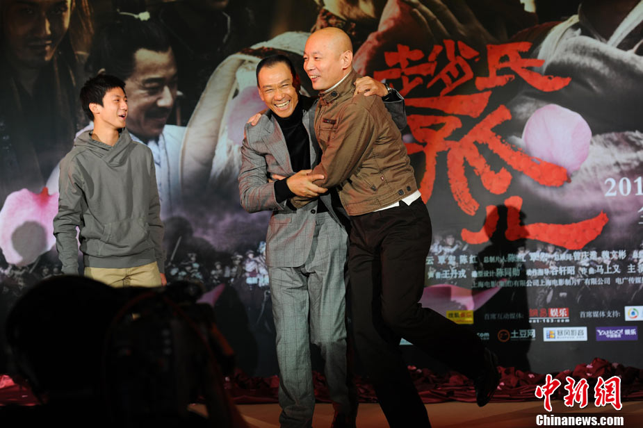11月15日,賀歲檔大片《趙氏孤兒》群星閃耀媒體見面會(huì)在北京盛大舉辦。導(dǎo)演陳凱歌攜主演葛優(yōu)、王學(xué)圻、黃曉明、范冰冰、趙文卓、海清、趙文浩出席。葛優(yōu)、王學(xué)圻飾演的程嬰和屠岸賈在片中有諸多較量,此前傳聞兩位大腕暗自使勁、互相飚戲。為了打破傳言,現(xiàn)場(chǎng)葛優(yōu)、王學(xué)圻上演“親密熊抱”,王學(xué)圻出人意料的“背摔”讓葛優(yōu)險(xiǎn)些摔倒在地,F(xiàn)場(chǎng)氣氛熱烈,笑聲不斷。中新社記者 李學(xué)仕 攝