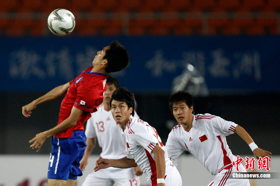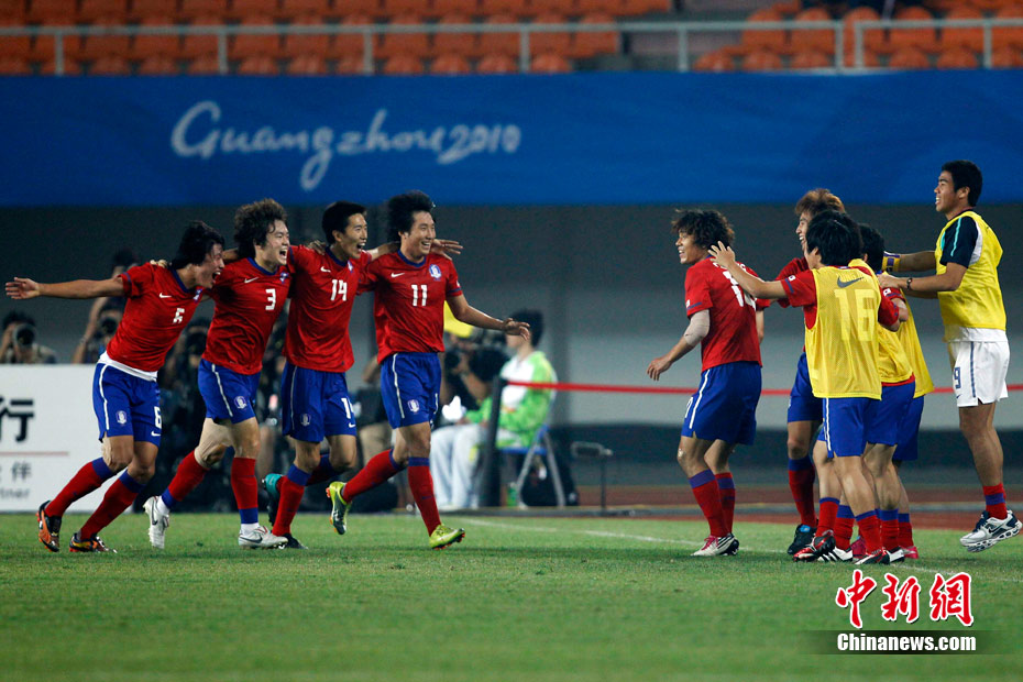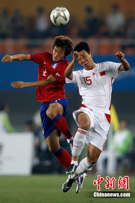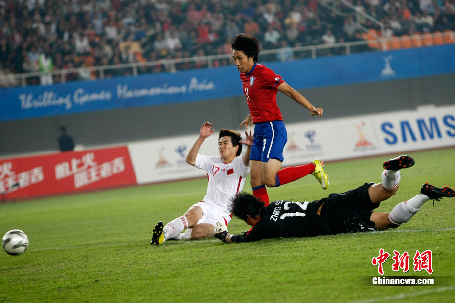11月15日晚,2010廣州亞運會男子足球1/8決賽中國隊與韓國隊的比賽在廣州天河體育場進行,最終中國隊0:3不敵對手,止步16強。 中新社記者 盛佳鵬 攝