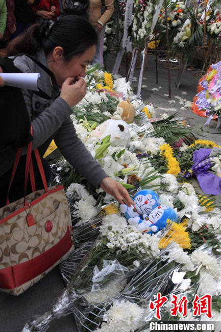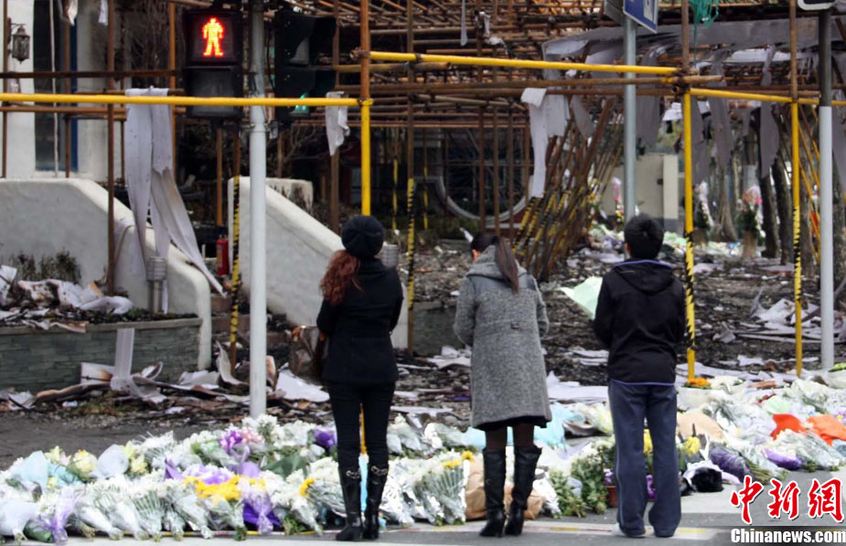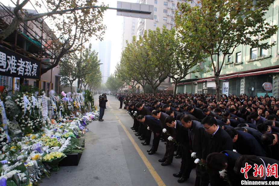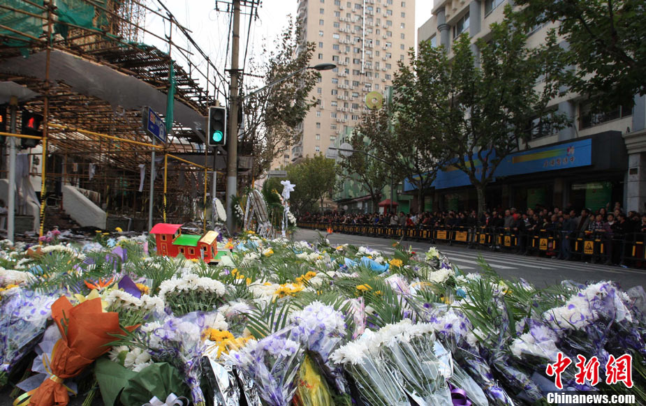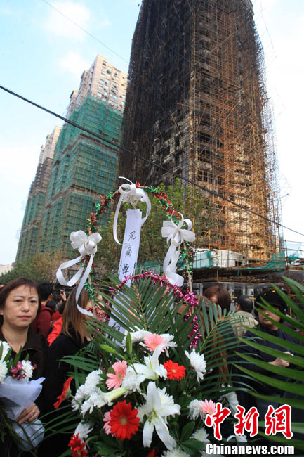 上!11·15”火災(zāi)大樓現(xiàn)場擺滿悼念鮮花