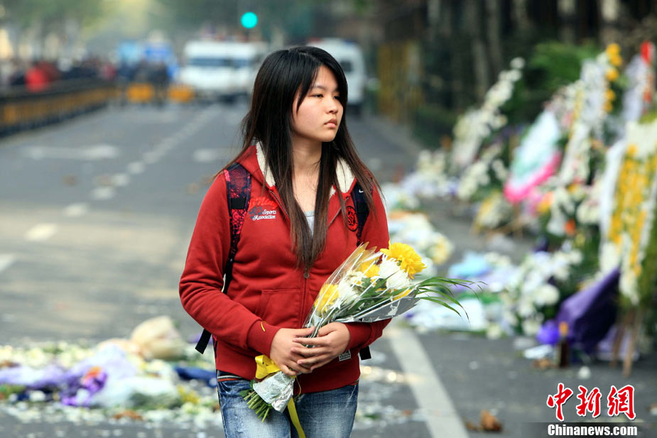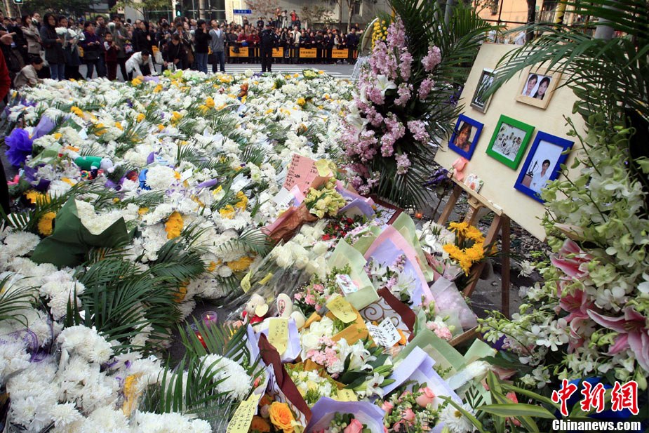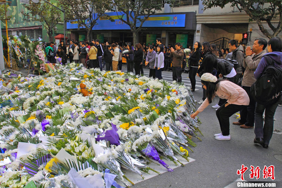 11月18日,在上海膠州路“11·15”火災(zāi)大樓前,擺滿了社會各界民眾悼念逝者的鮮花。中新社記者 潘索菲 攝