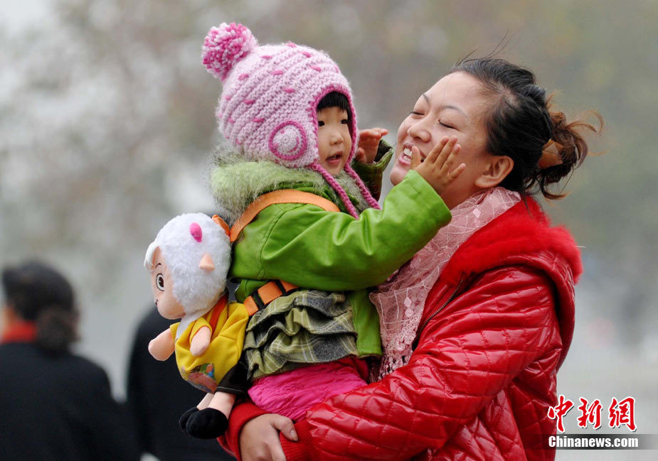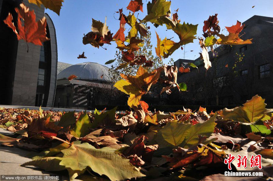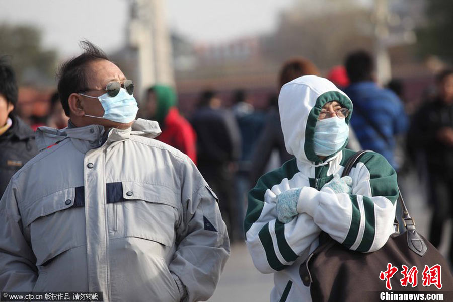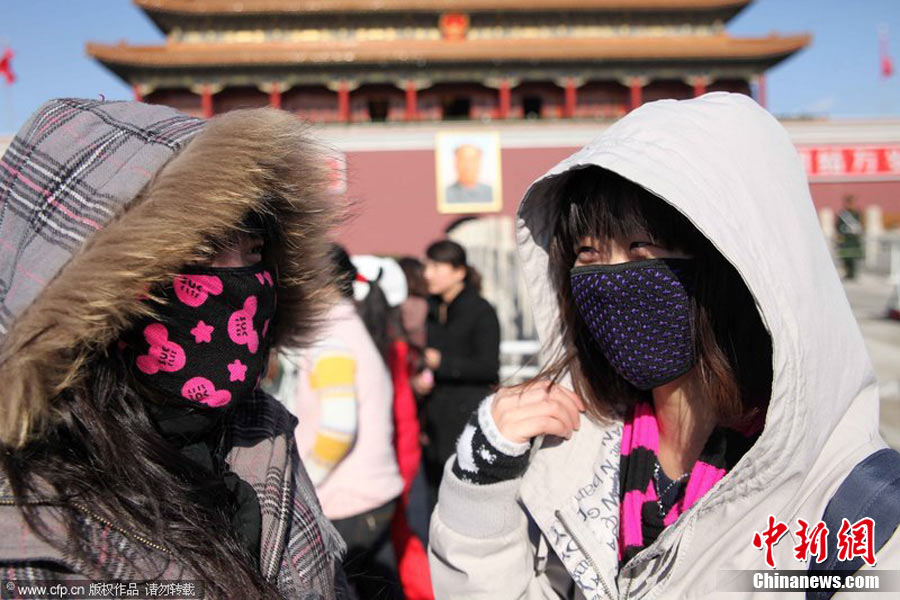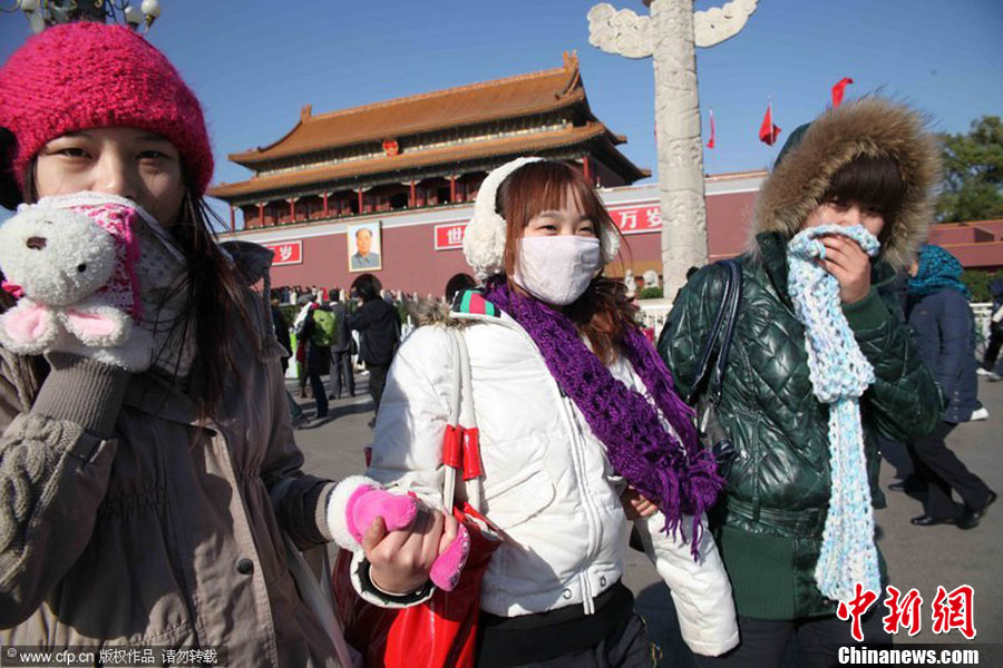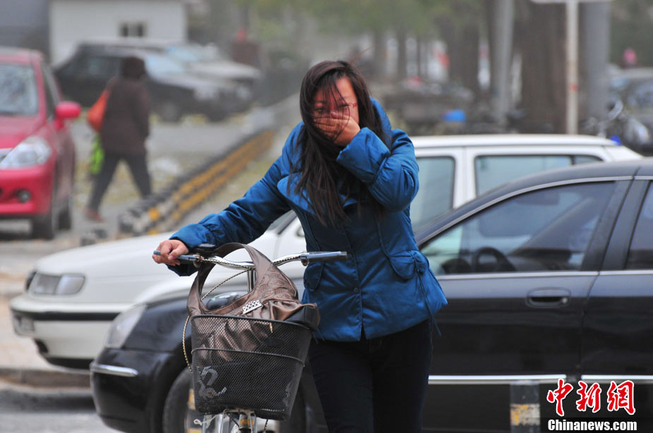 2010年11月21日,北京出現(xiàn)大風天氣,風力達到5-6級,風中伴有沙塵,給行人帶來諸多不便。陳曉根 攝 圖片來源:CFP視覺中國