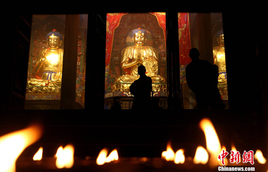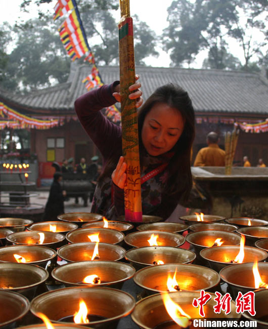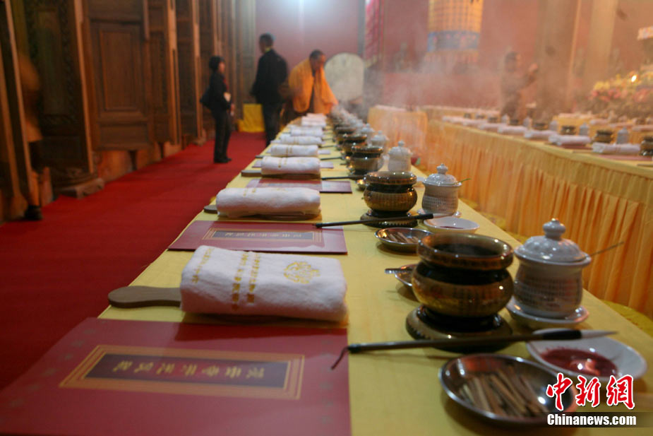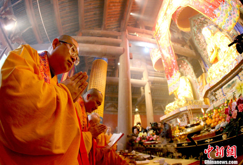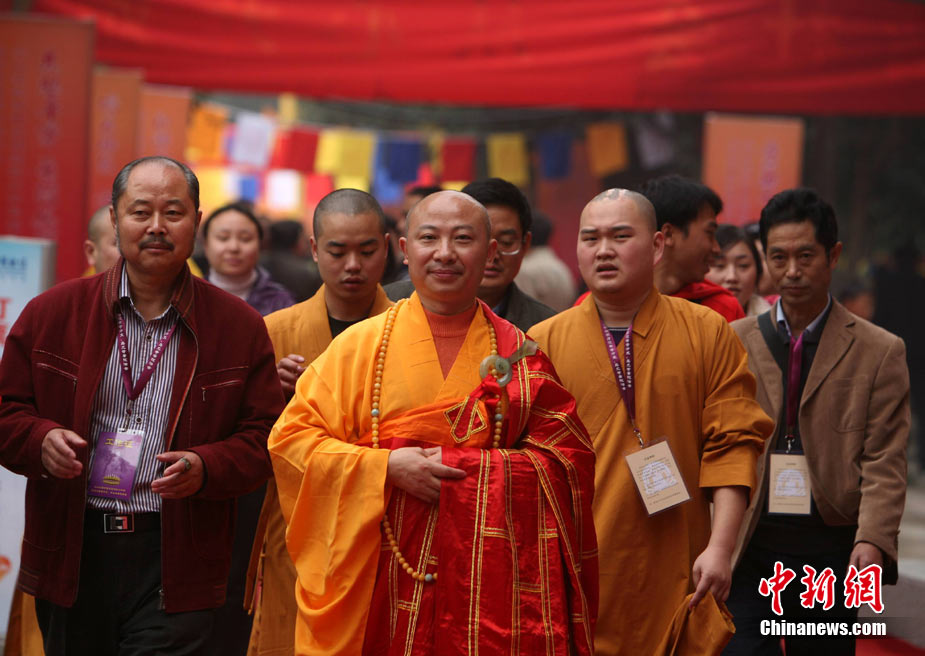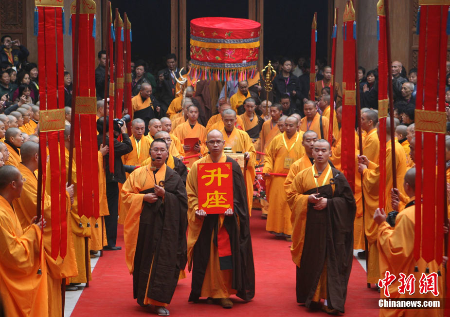 11月21日,“樂(lè)山凌云寺重光暨照觀法師榮膺凌云寺方丈、烏尤寺晉院升座法會(huì)”在四川樂(lè)山凌云寺、烏尤寺舉行。這標(biāo)志著有著1400年的千年名寺凌云寺經(jīng)歷“5·12” 汶川大地震的劫難后再現(xiàn)昔日光彩。圖為樂(lè)山凌云寺重光法會(huì)現(xiàn)場(chǎng)。中新社發(fā) 劉忠俊 攝