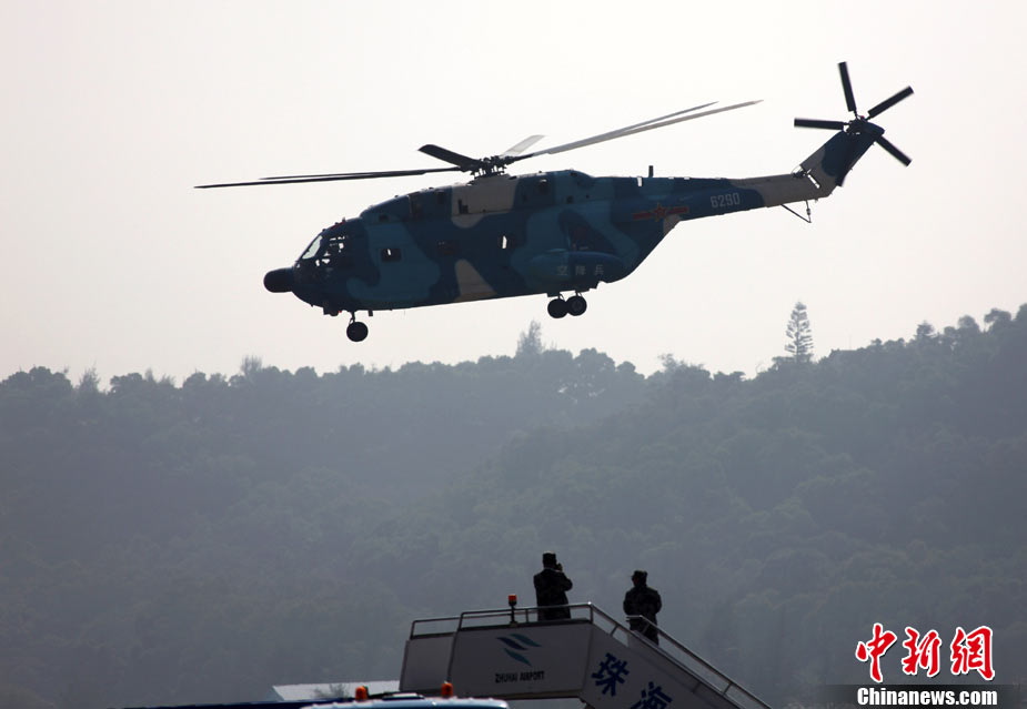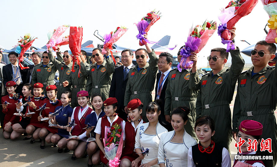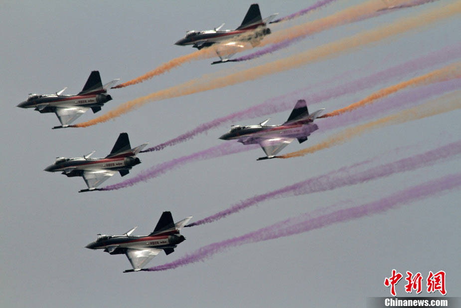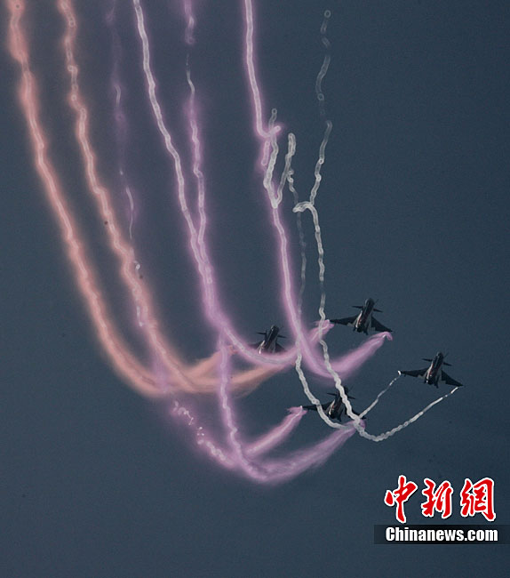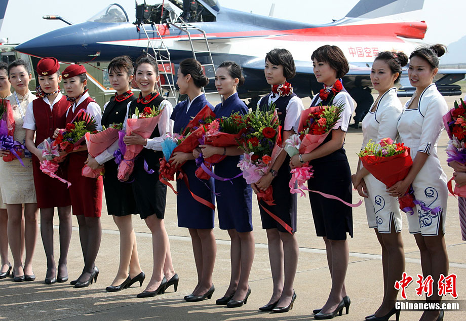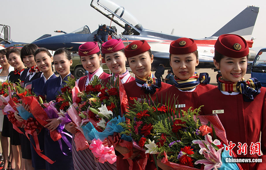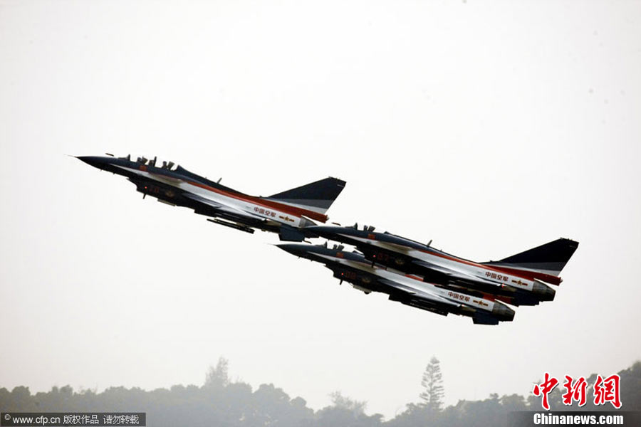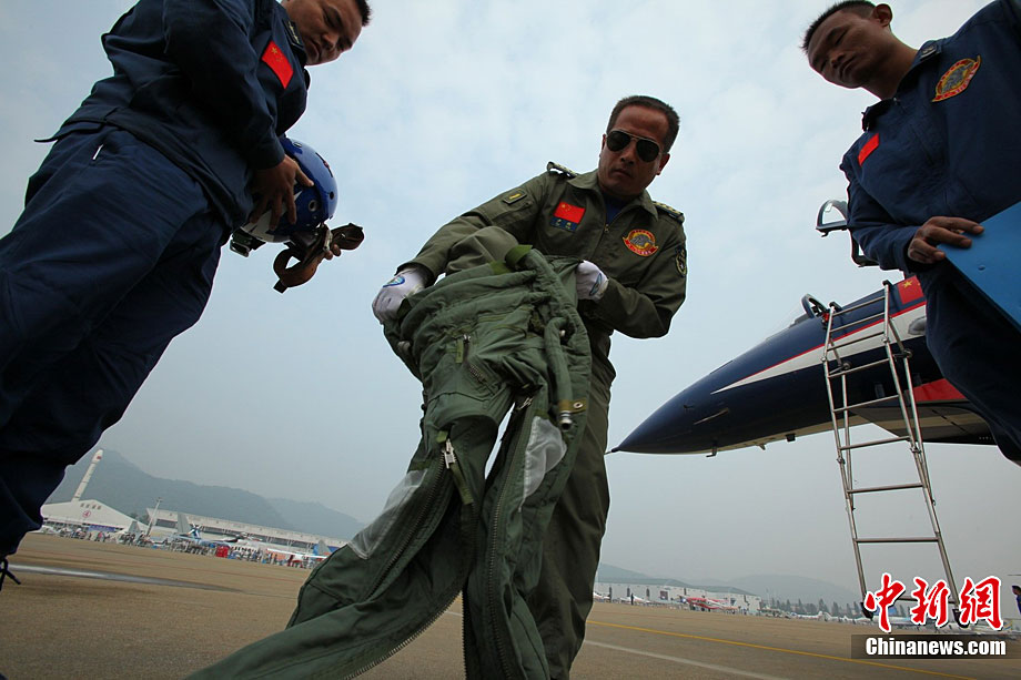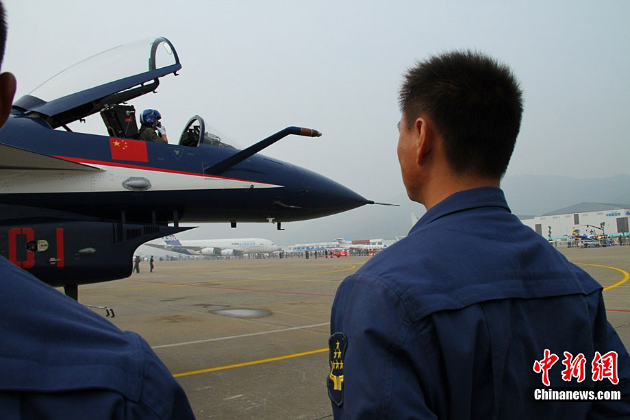 11月21日,為期6天的第八屆中國國際航空航天博覽會在珠海落幕。圖為中國空軍八一飛行表演隊表演結(jié)束后,機務(wù)人員試車作準備飛行工作。 中新社發(fā) 譚超 攝
