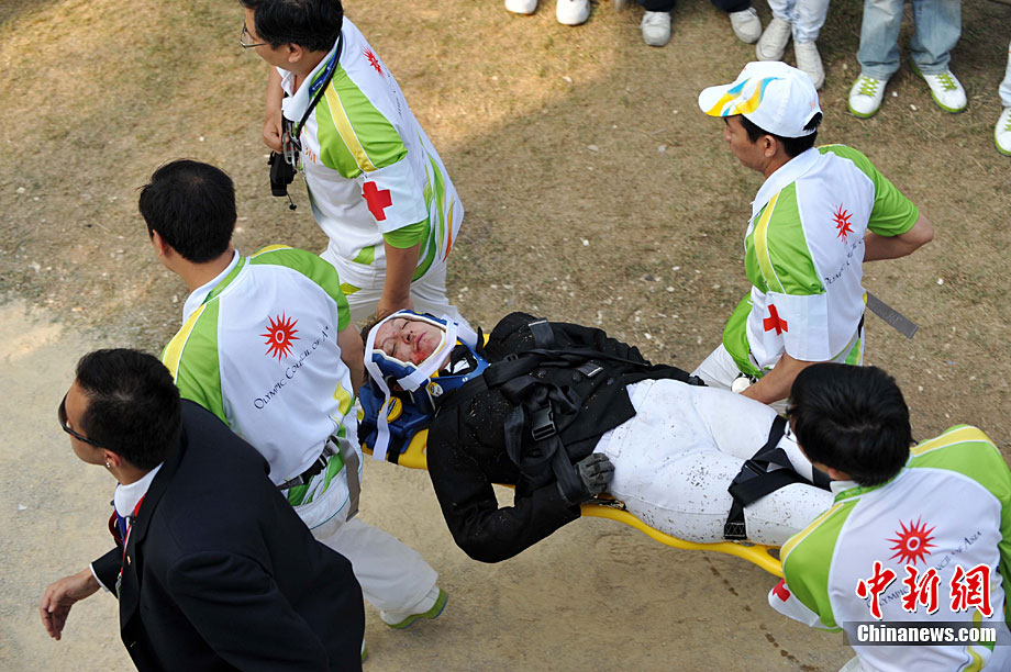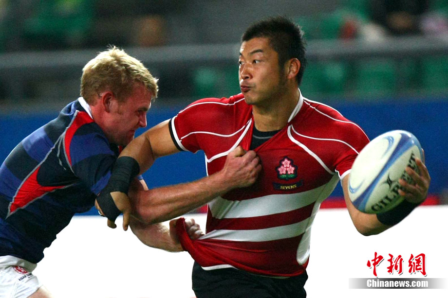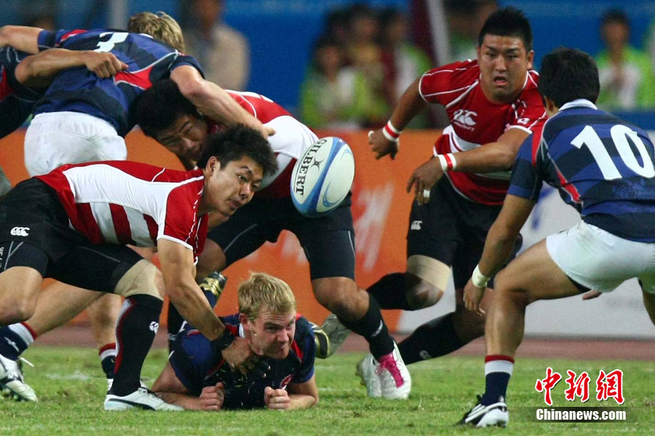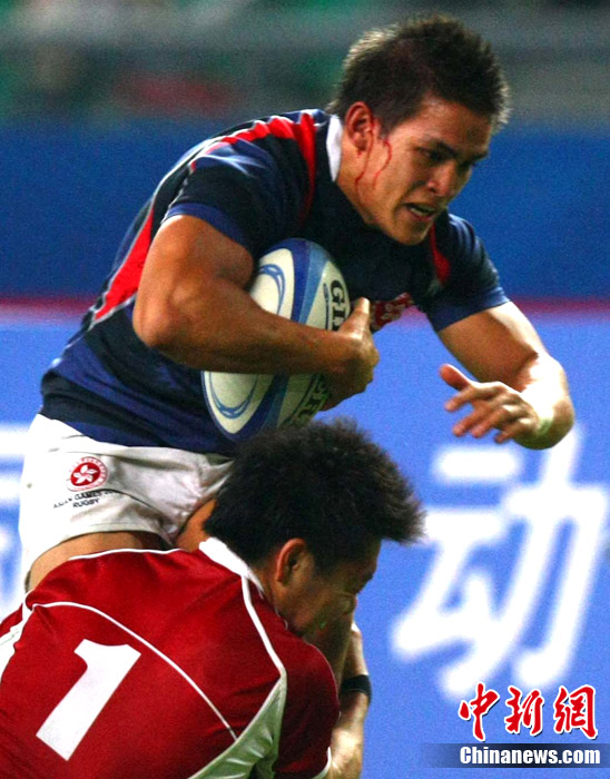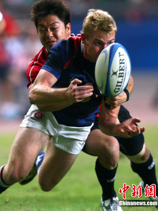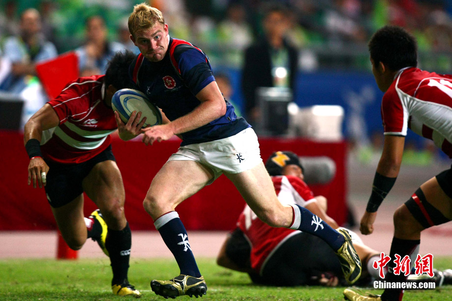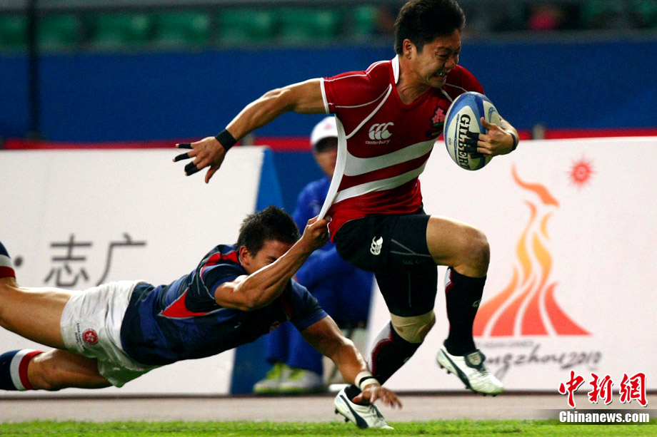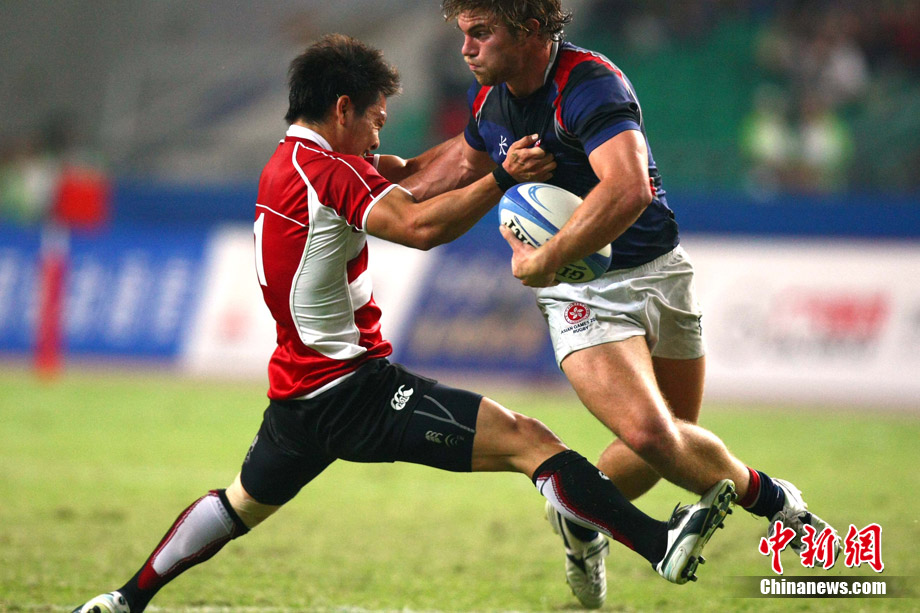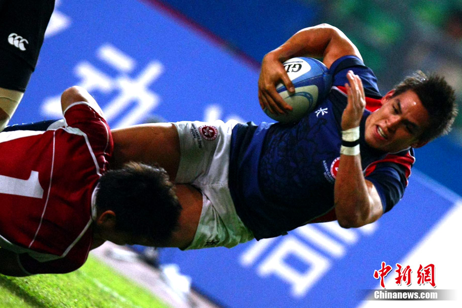 11月23日,廣州亞運(yùn)會(huì)橄欖球賽場結(jié)束了全部賽事的爭奪,在男子組決賽中,中國香港隊(duì)(藍(lán))以21:28不敵日本隊(duì),獲得一枚銀牌。圖為賽場激烈火爆的精彩瞬間。中新社記者 富田 攝