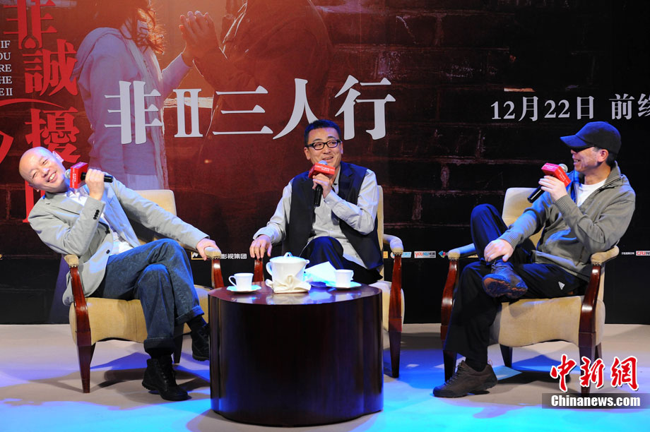 由華誼兄弟出品、馮小剛導演、王朔與馮小剛聯(lián)合編劇的《非誠勿擾2》將于12月22日賀歲上映。11月24日,《非誠勿擾2》舉行了“《非2》三人行”發(fā)布會,正式發(fā)布《非誠勿擾2》升級版幕后花絮,馮小剛、葛優(yōu)、竇文濤組成三人行搭檔。在竇文濤的幽默調(diào)侃下,葛優(yōu)馮小剛熱聊新戲,笑聲不斷。在當場公布的升級篇幕后花絮中,秦奮和梁笑笑的親密戲也出露端倪,葛優(yōu)舒淇在美景中多次深情依偎,一場兩人在床上的鏡頭更令人期待。馮小剛承認,“是多了一些親密戲,但都是幽默的處理!备饍(yōu)也謙虛表示,自己演親密戲其實并不拿手。中新社記者 李學仕 攝