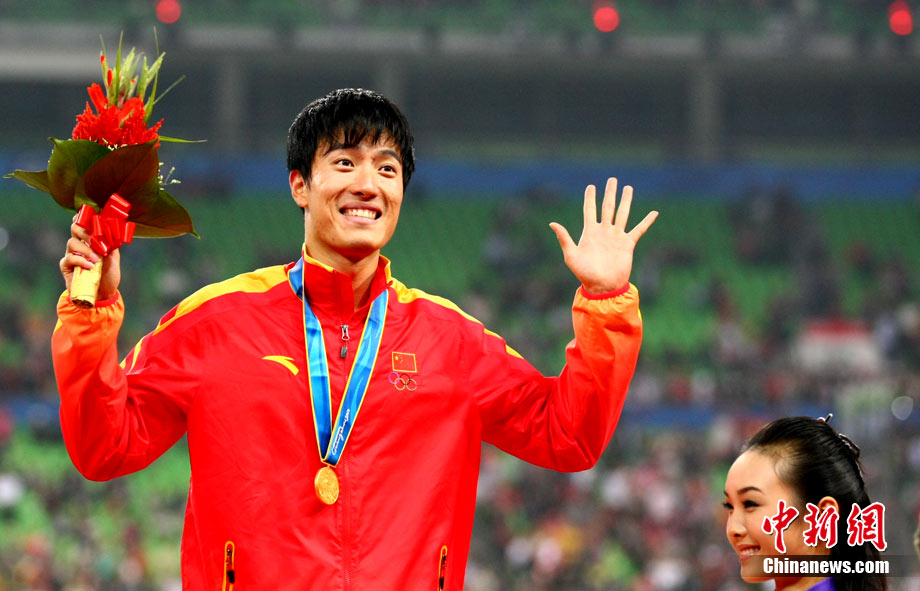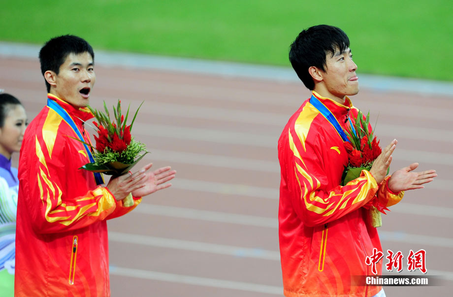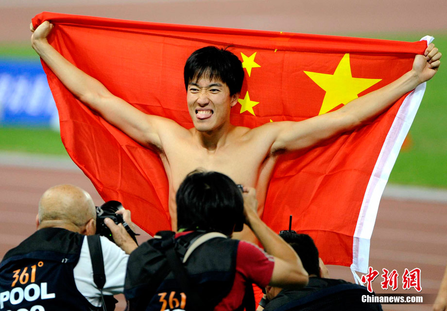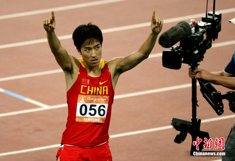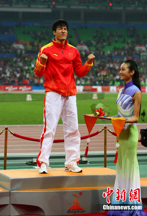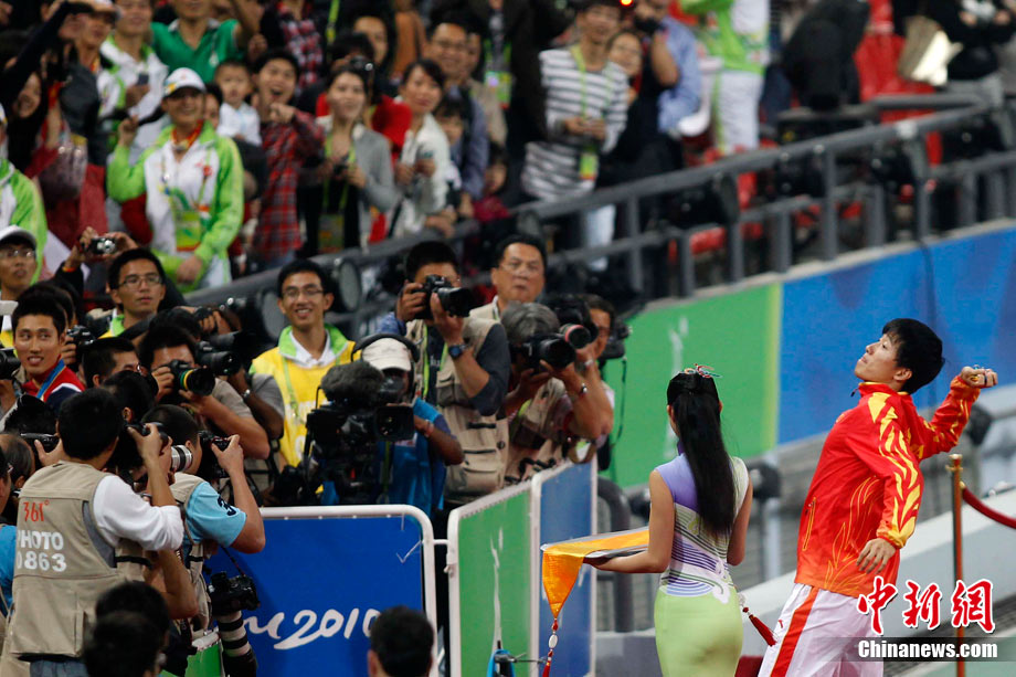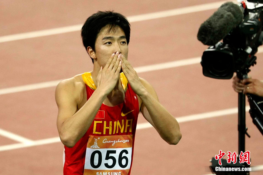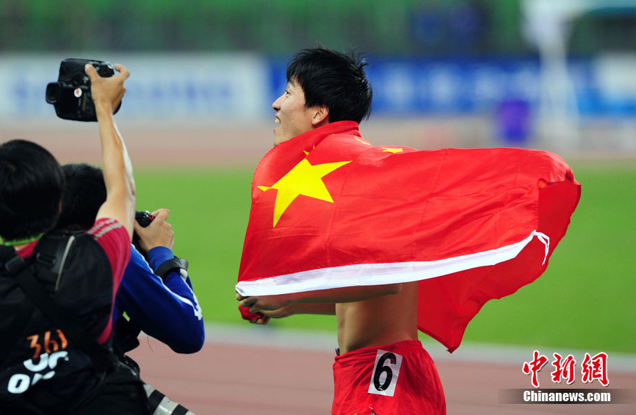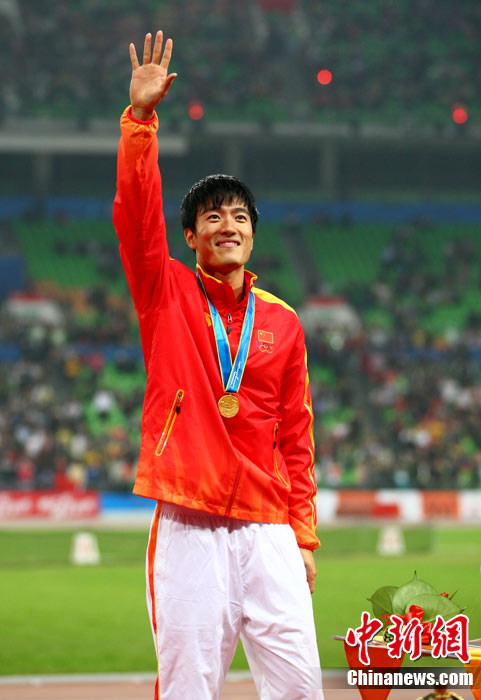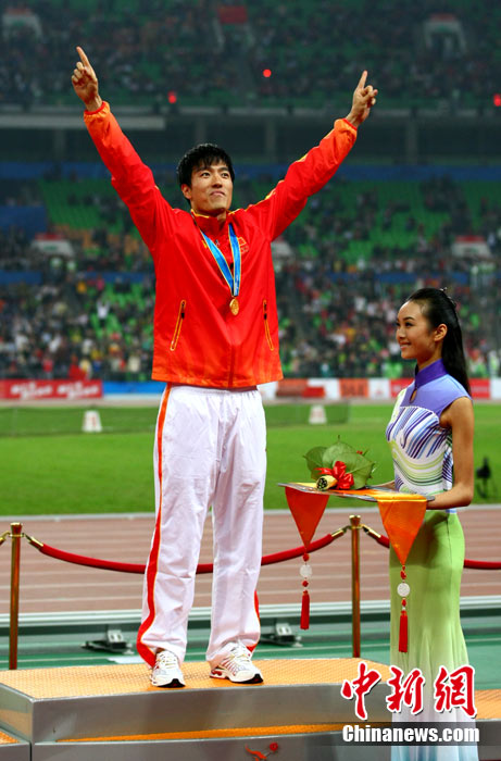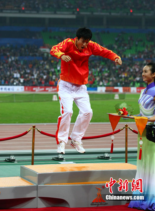 11月24日,廣州亞運(yùn)會男子110米欄決賽,劉翔以13秒09的成績奪得金牌,這一成績打破了亞運(yùn)會紀(jì)錄。劉翔以一場酣暢淋漓的勝利宣告了自己的回歸。圖為劉翔跳上領(lǐng)獎臺。中新社記者 富田 攝