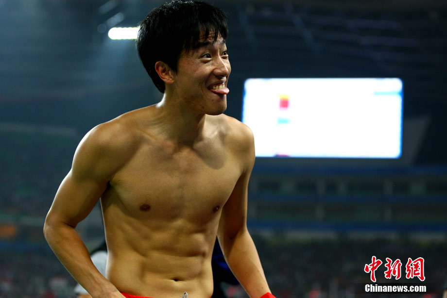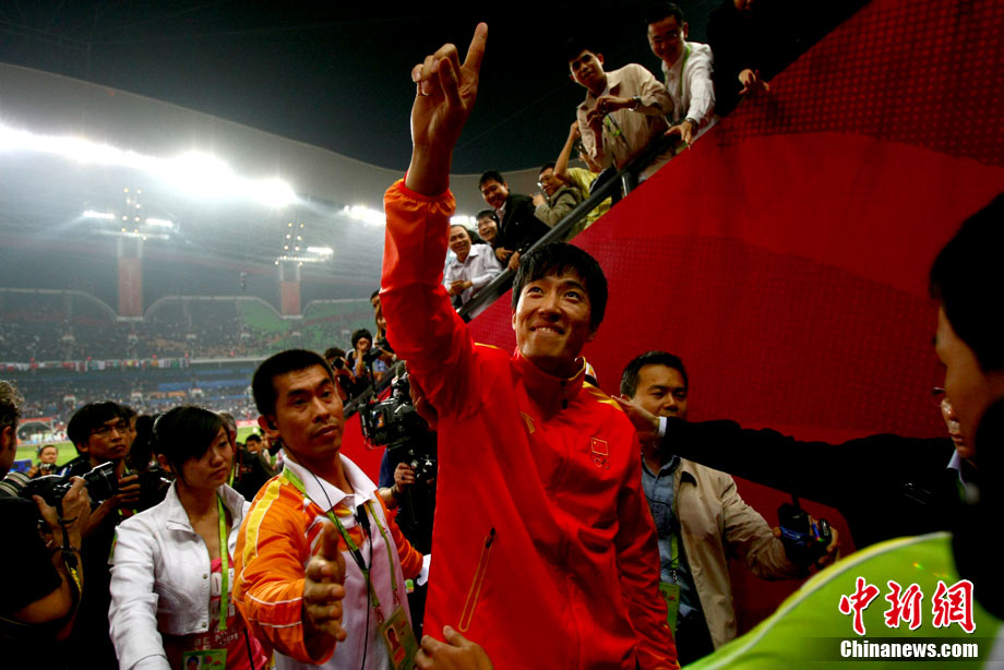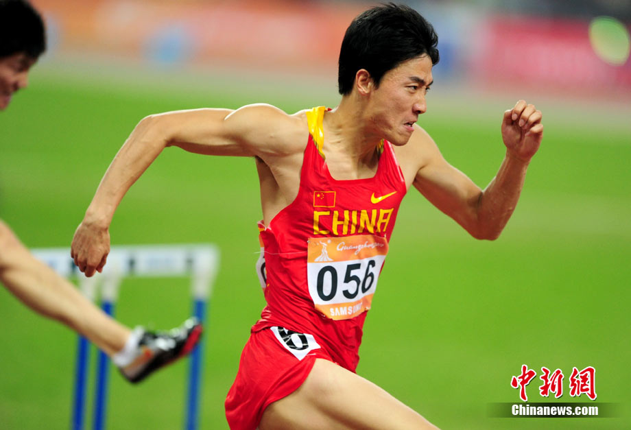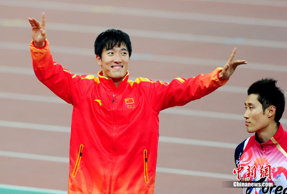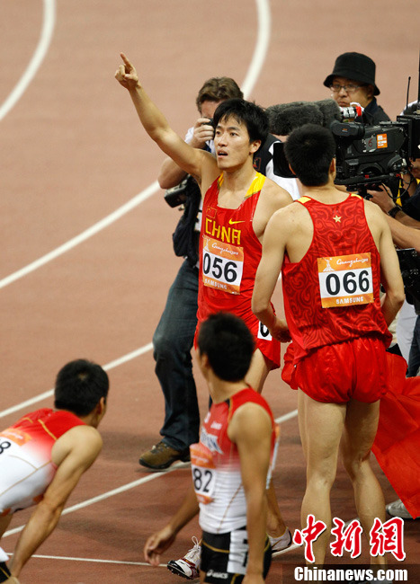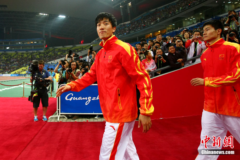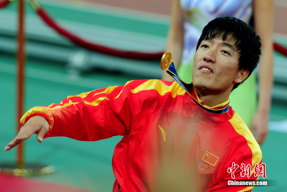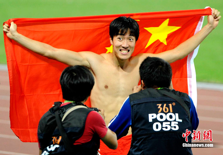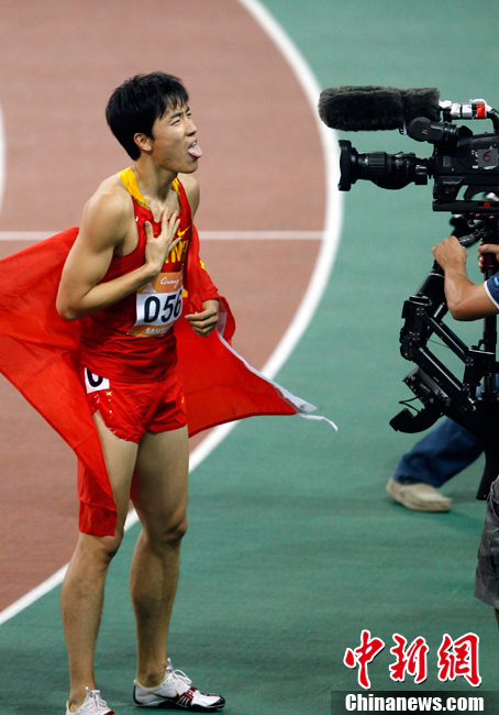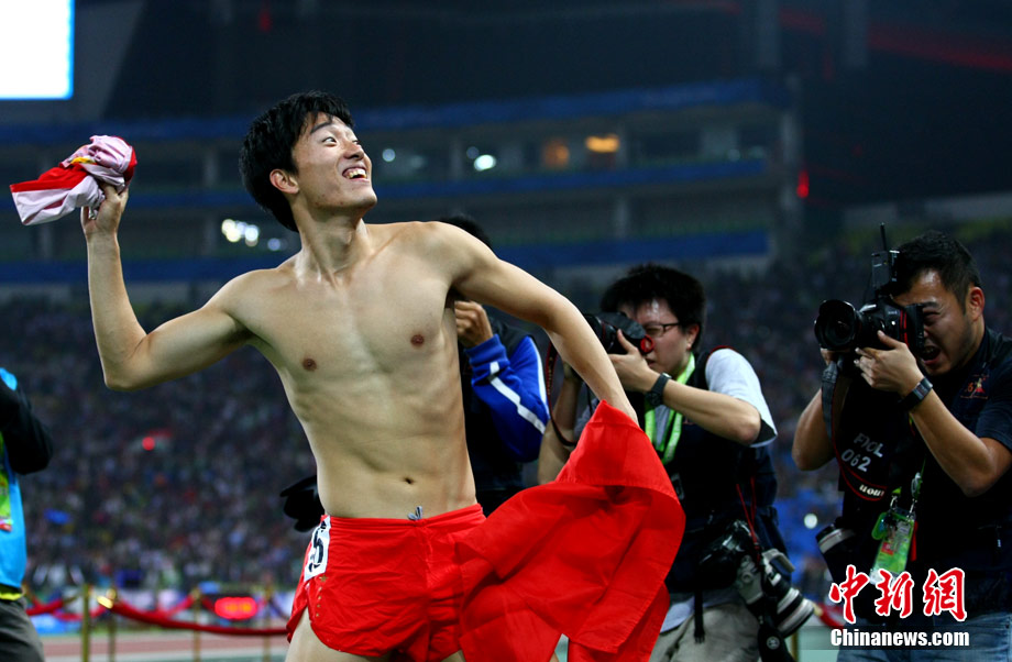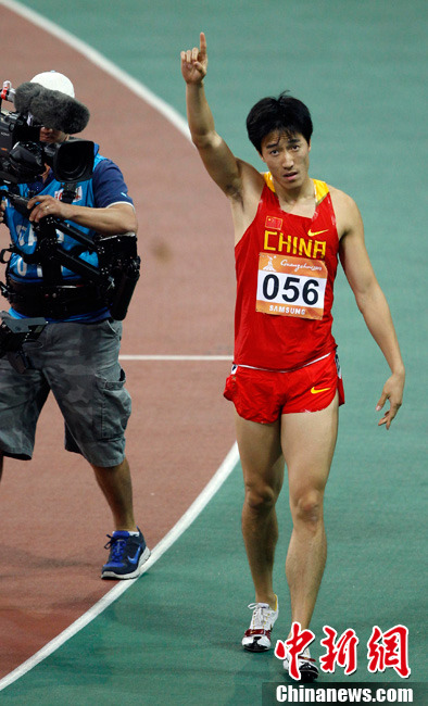 11月24日,廣州亞運(yùn)會男子110米欄決賽,劉翔以13秒09的成績奪得金牌,這一成績打破了亞運(yùn)會紀(jì)錄。劉翔以一場酣暢淋漓的勝利宣告了自己的回歸。圖為劉翔跳上領(lǐng)獎臺。中新社記者 富田 攝