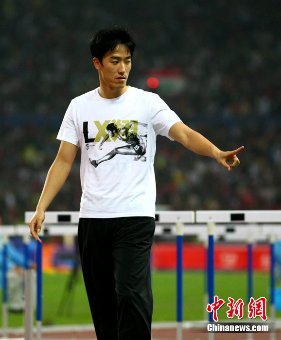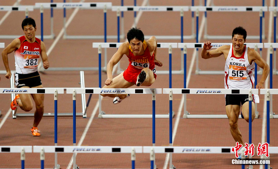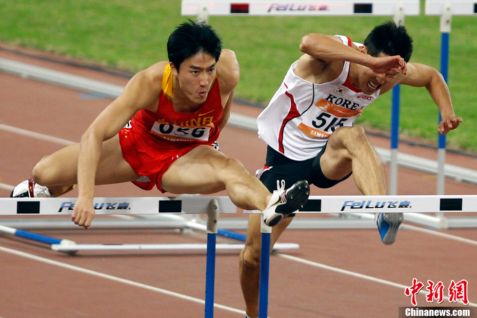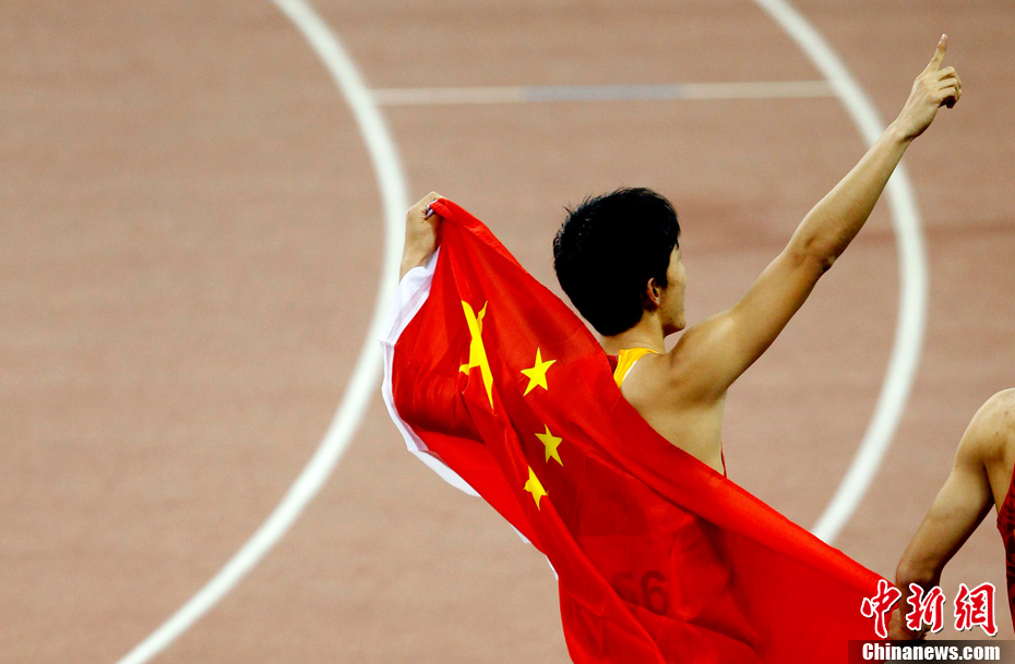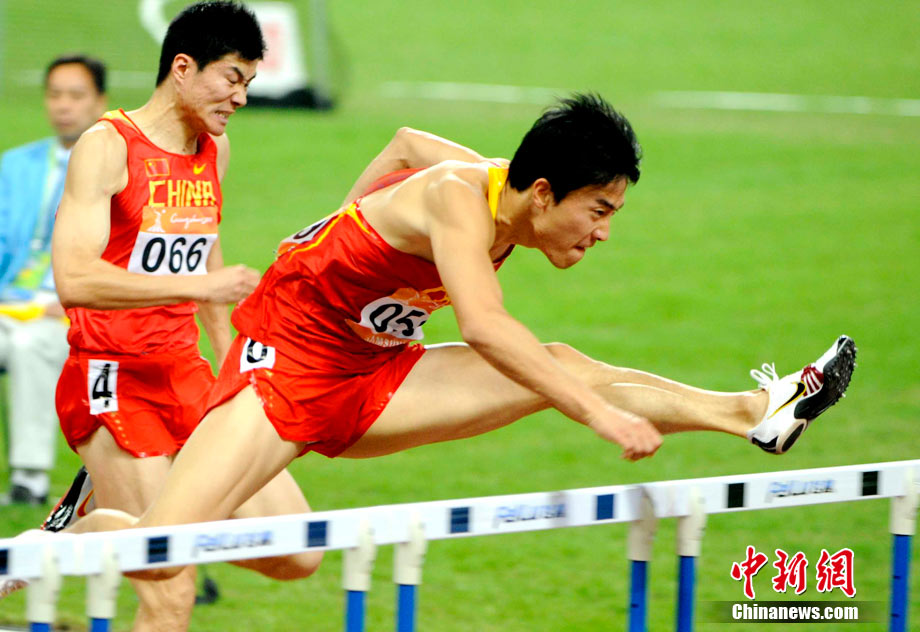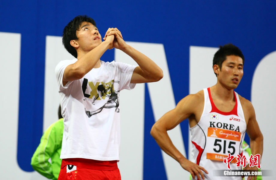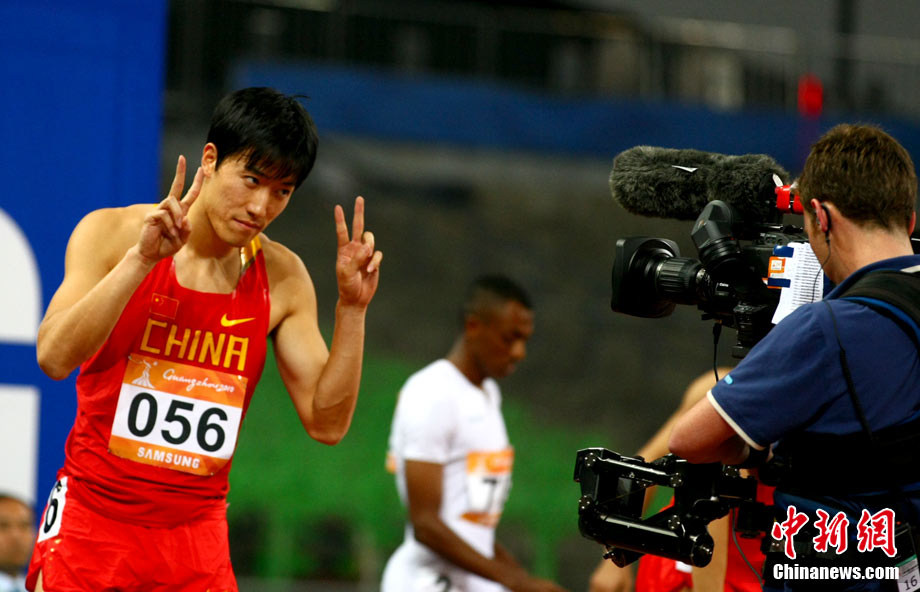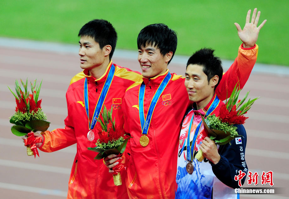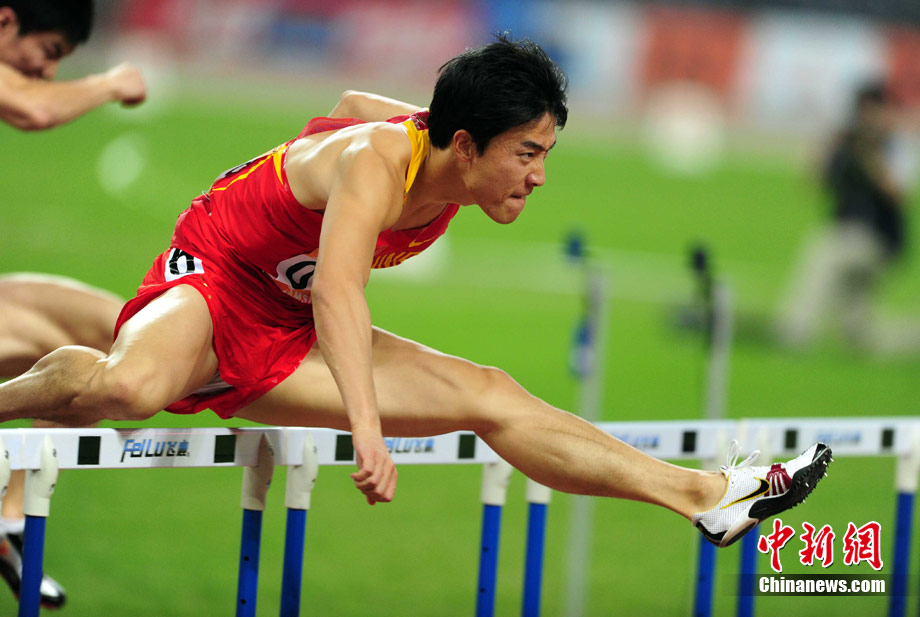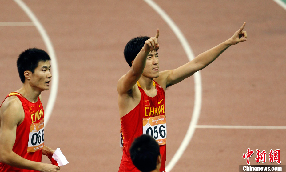 11月24日,廣州亞運(yùn)會男子110米欄決賽,劉翔以13秒09的成績奪得金牌,這一成績打破了亞運(yùn)會紀(jì)錄。劉翔以一場酣暢淋漓的勝利宣告了自己的回歸。圖為劉翔跳上領(lǐng)獎臺。中新社記者 富田 攝