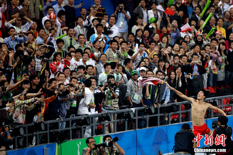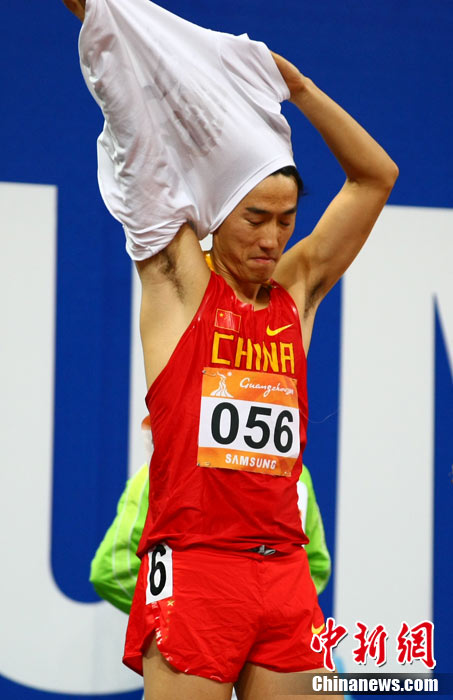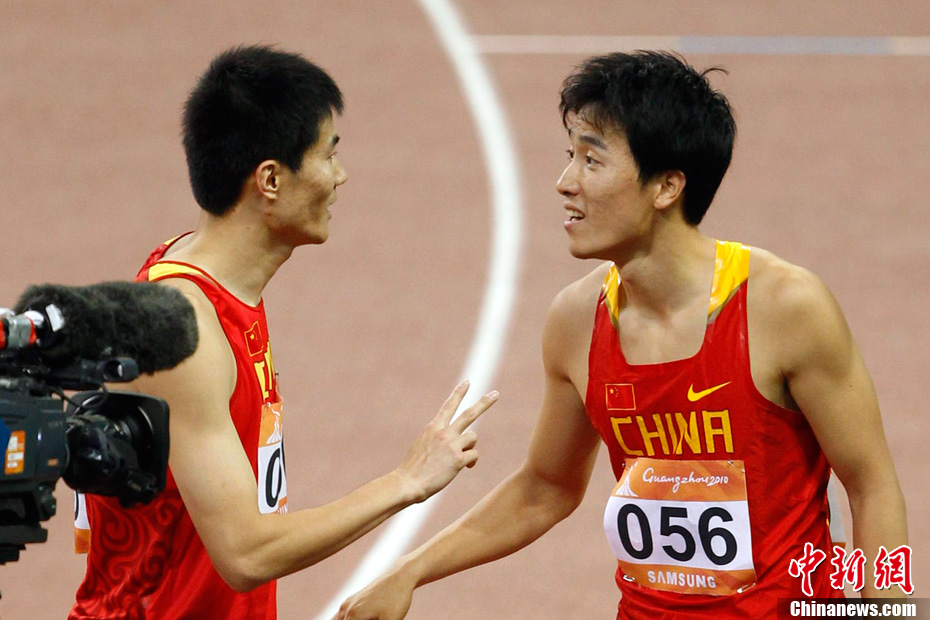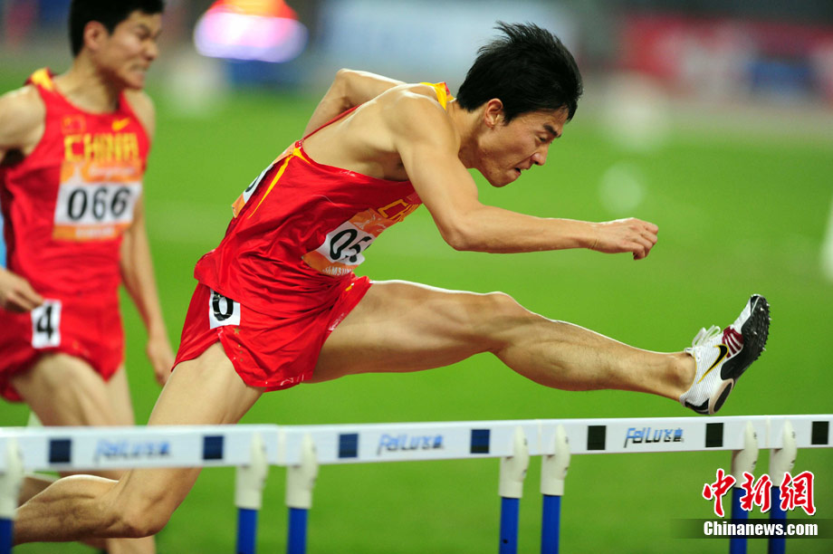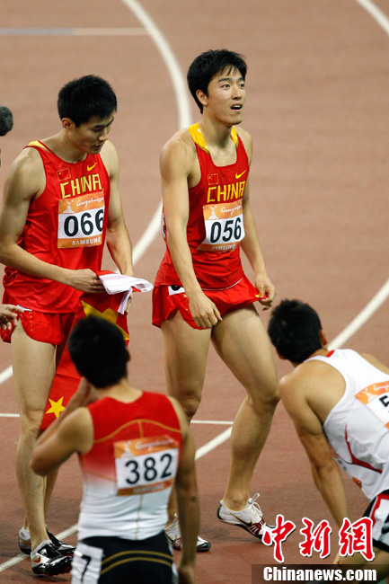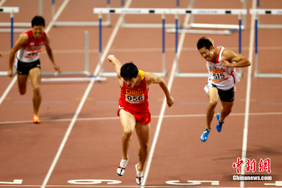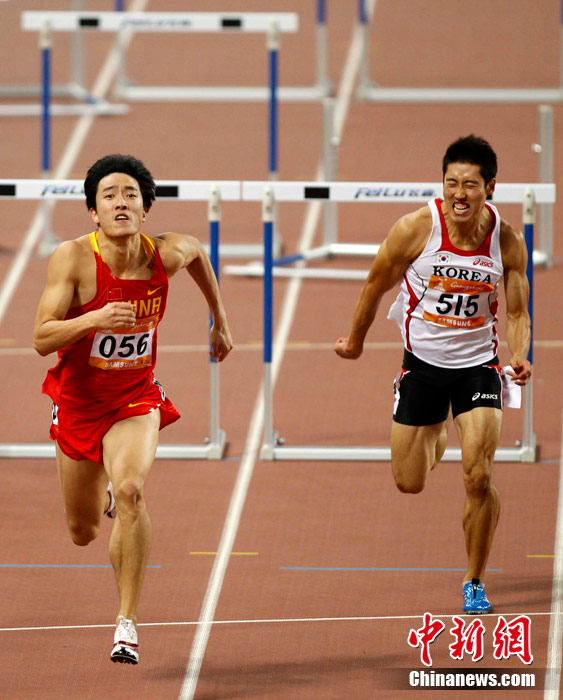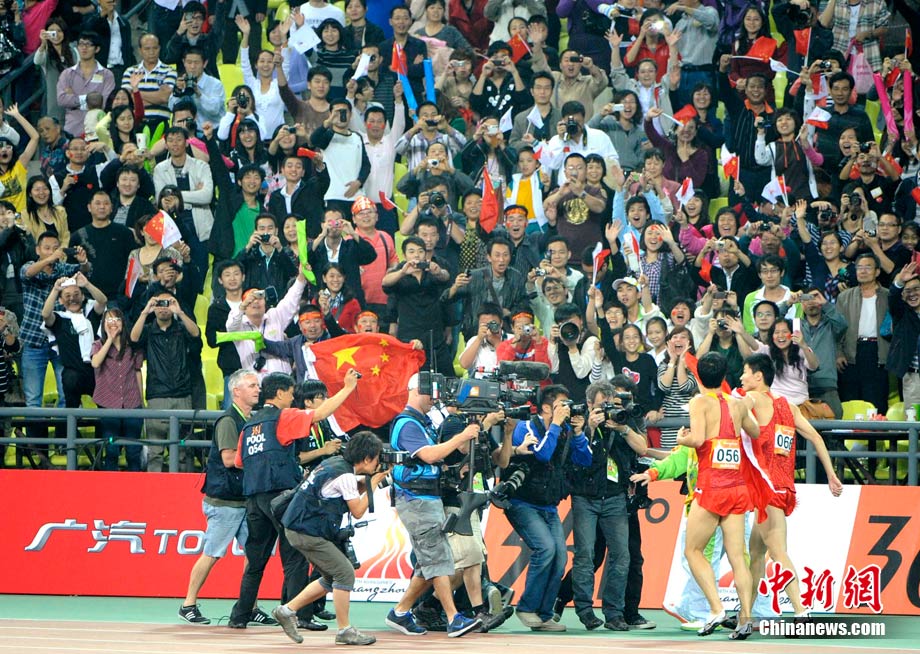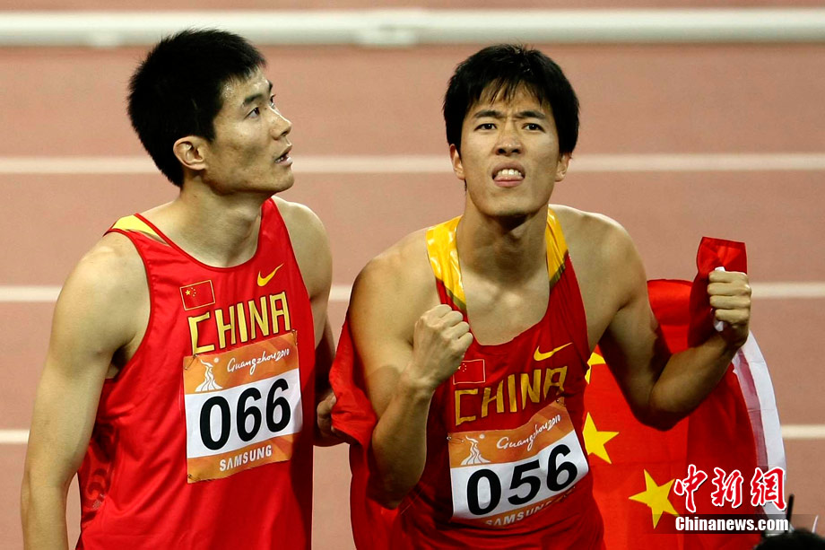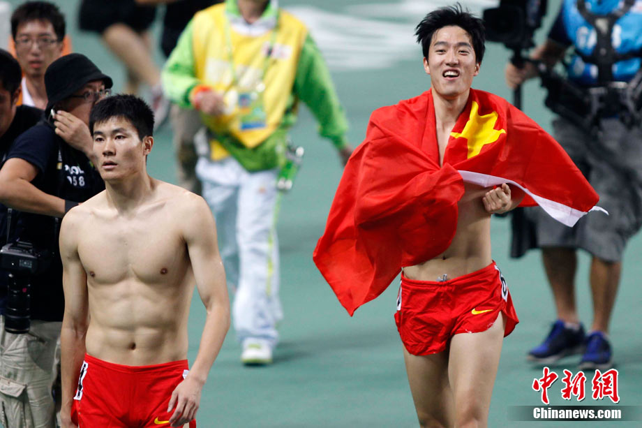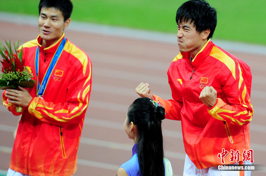 11月24日,廣州亞運(yùn)會男子110米欄決賽,劉翔以13秒09的成績奪得金牌,這一成績打破了亞運(yùn)會紀(jì)錄。劉翔以一場酣暢淋漓的勝利宣告了自己的回歸。圖為劉翔跳上領(lǐng)獎臺。中新社記者 富田 攝