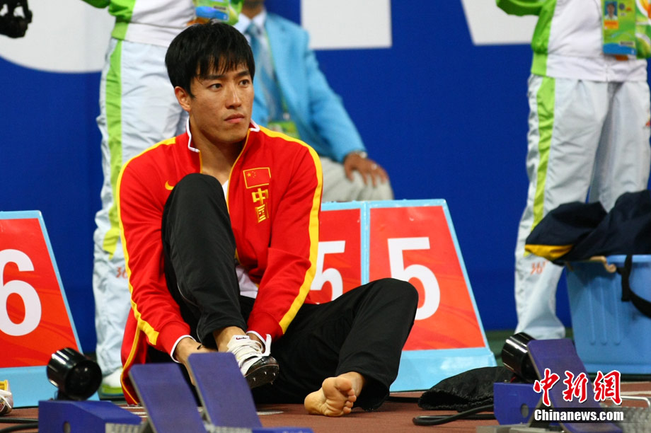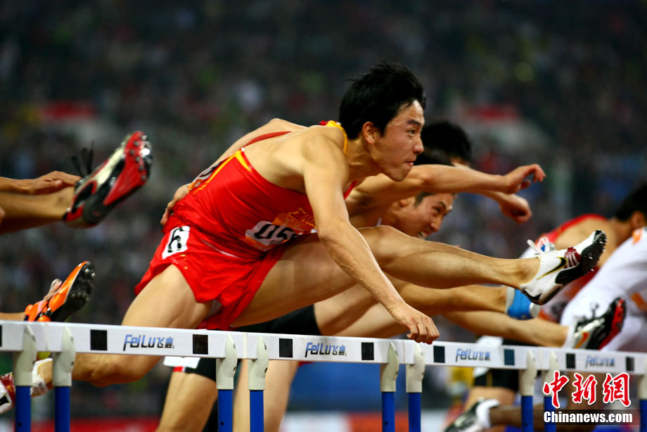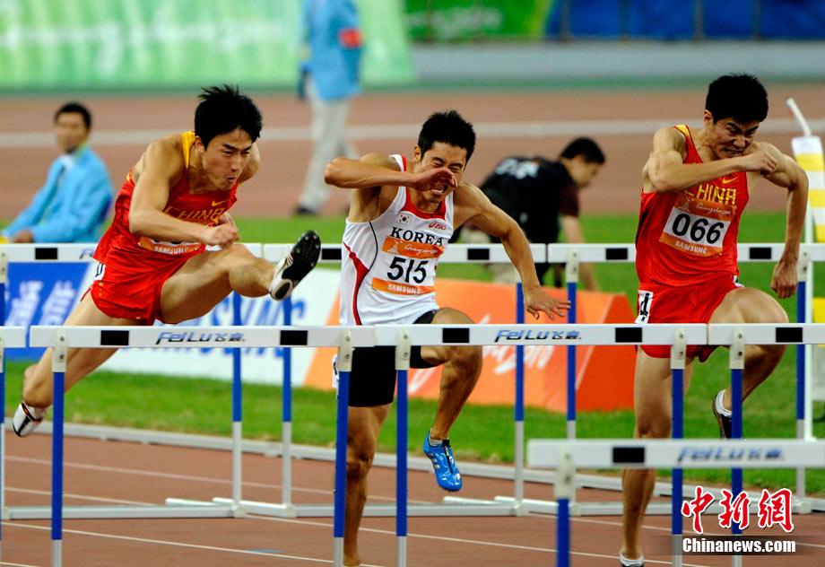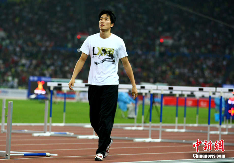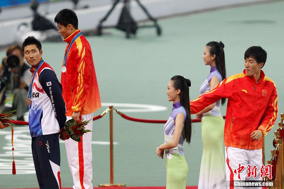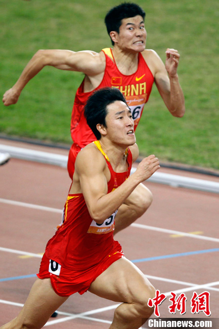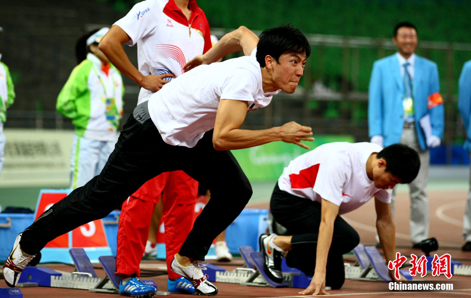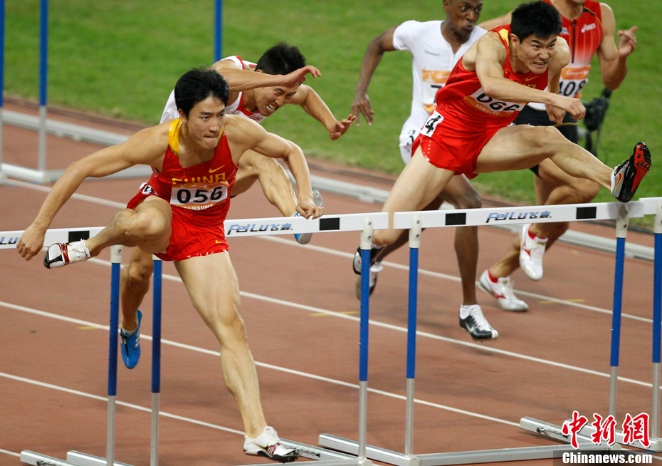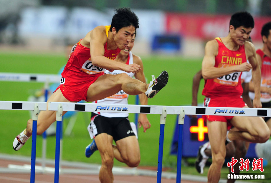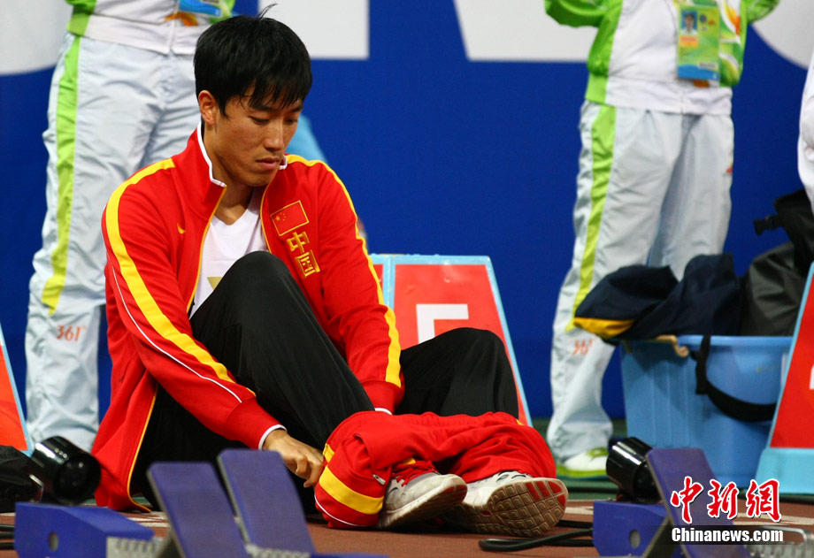 11月24日,廣州亞運(yùn)會男子110米欄決賽,劉翔以13秒09的成績奪得金牌,這一成績打破了亞運(yùn)會紀(jì)錄。劉翔以一場酣暢淋漓的勝利宣告了自己的回歸。圖為劉翔跳上領(lǐng)獎臺。中新社記者 富田 攝