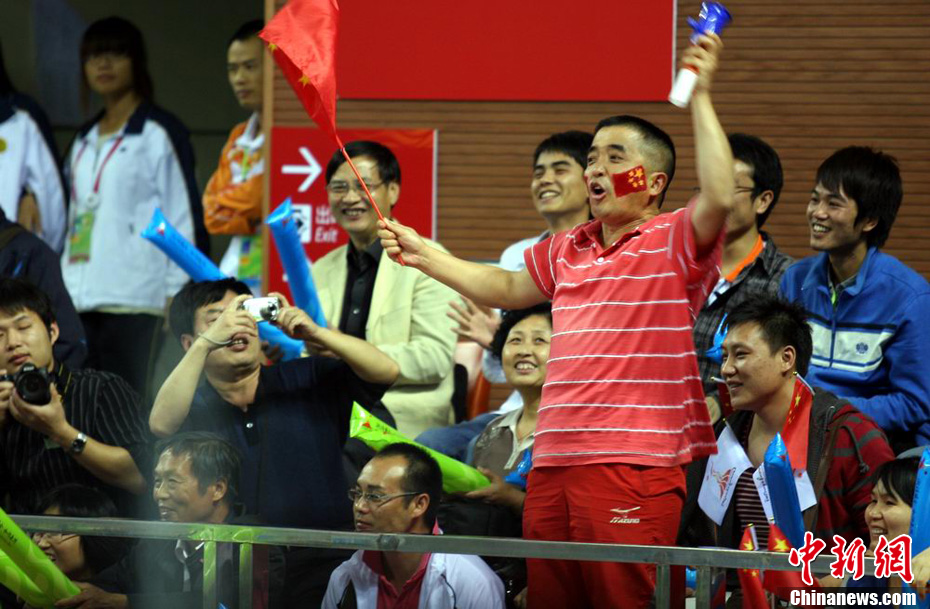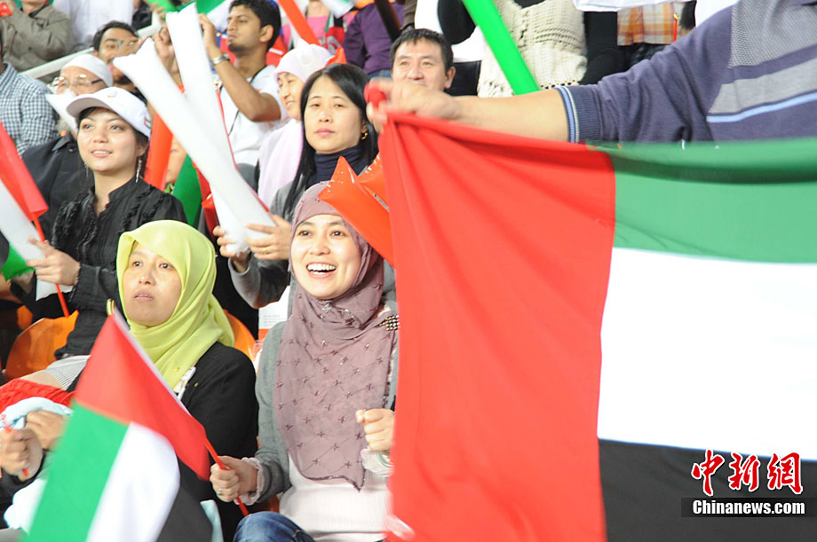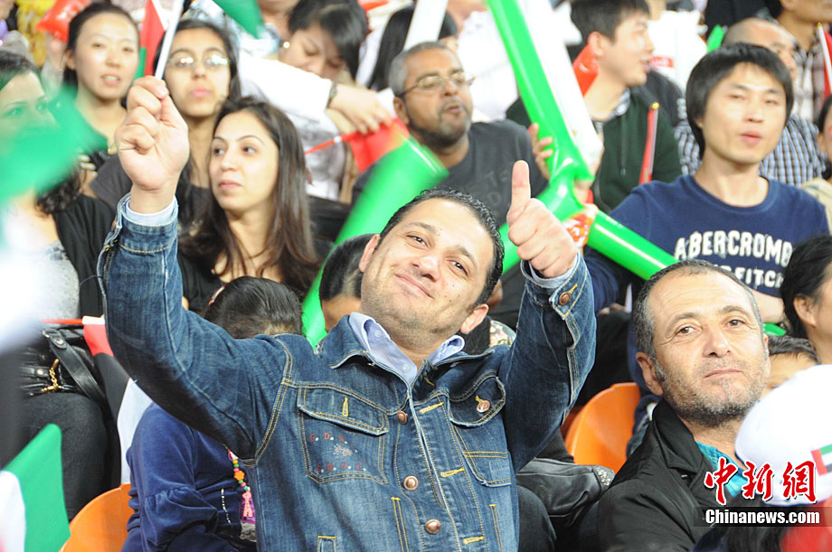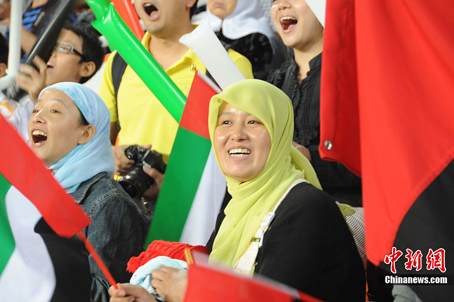 日本男足25日晚與阿聯(lián)酋展開亞運(yùn)男足金牌爭奪戰(zhàn),場上雙方均有為數(shù)眾多的熱情球迷助陣,圖為身穿民族服裝的漂亮阿聯(lián)酋女球迷。 中新社記者 唐貴江 攝
