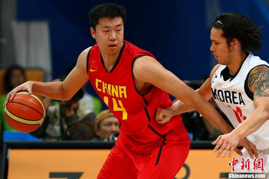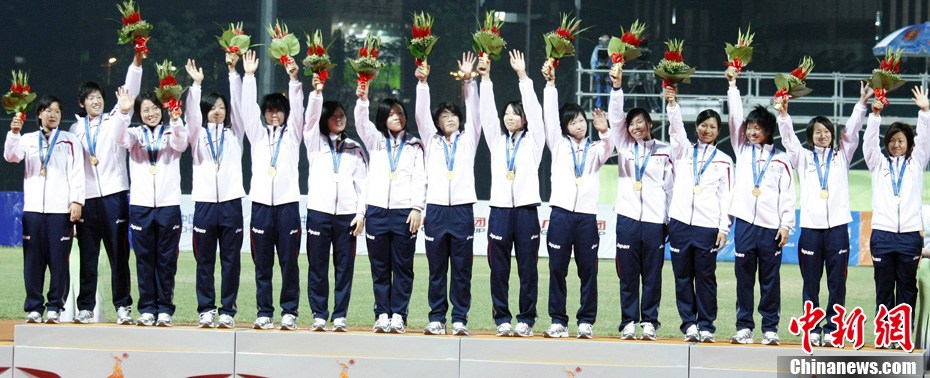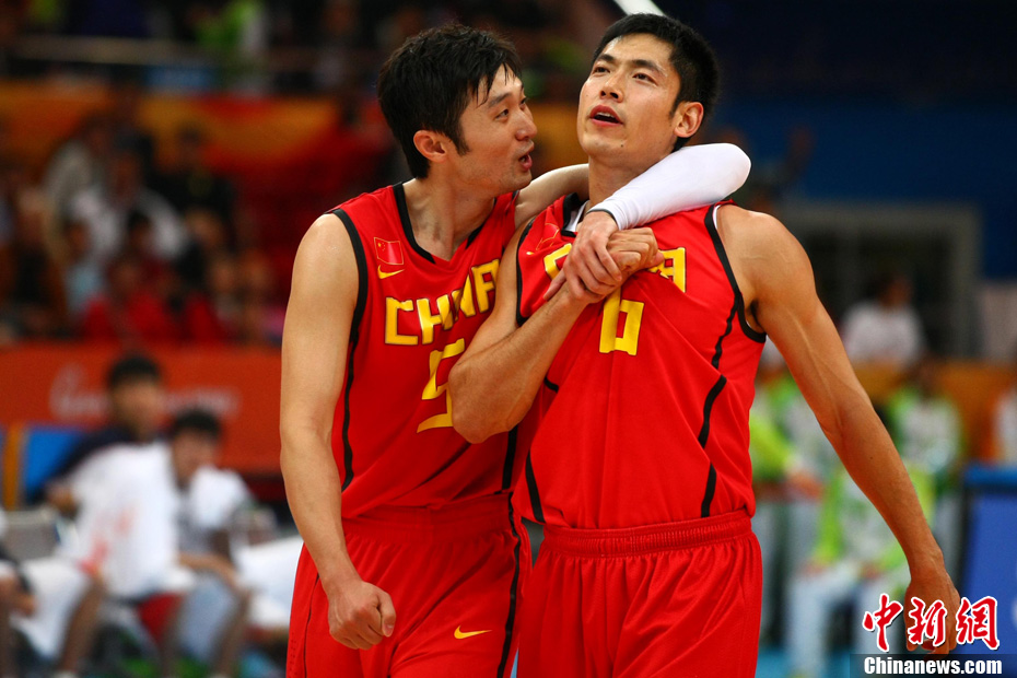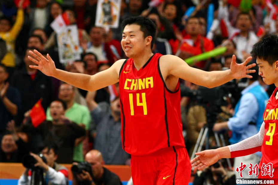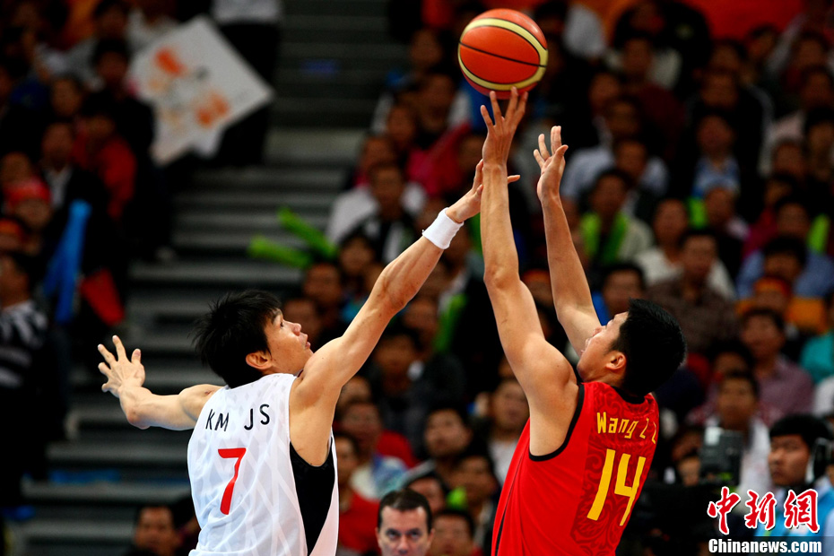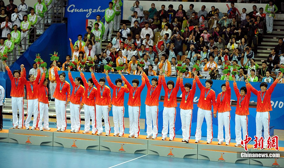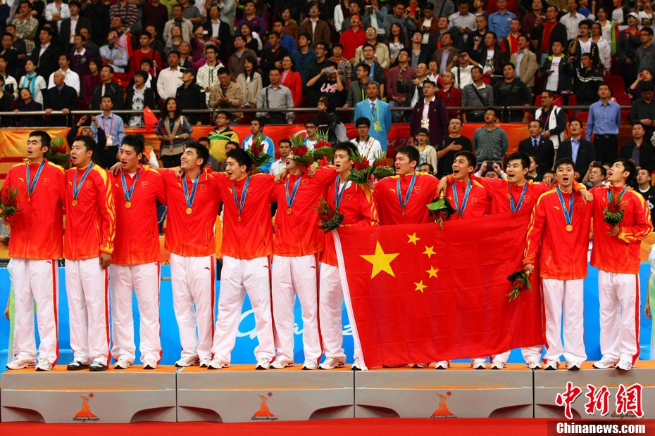 11月26日晚,2010亞運(yùn)會(huì)男籃決賽,中國(guó)隊(duì)77-71戰(zhàn)勝韓國(guó)奪冠。圖為中國(guó)隊(duì)隊(duì)員向王治郅鞠躬致意。中新社記者 富田 攝
