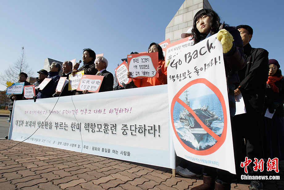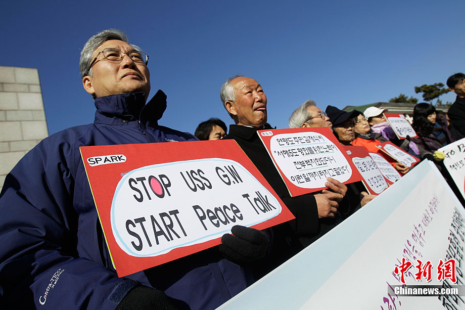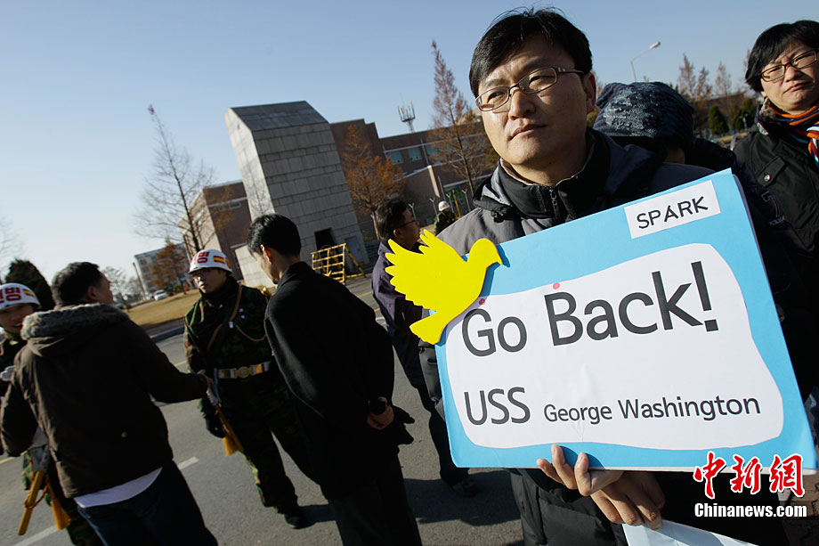 11月28日,韓國民眾在韓國軍事基地前舉行示威游行活動,譴責美國派遣航母參加美韓聯(lián)合軍演。這些民眾表示反對美國“喬治·華盛頓”號航母進入韓國領(lǐng)土,并與韓國軍方舉行軍事演習。