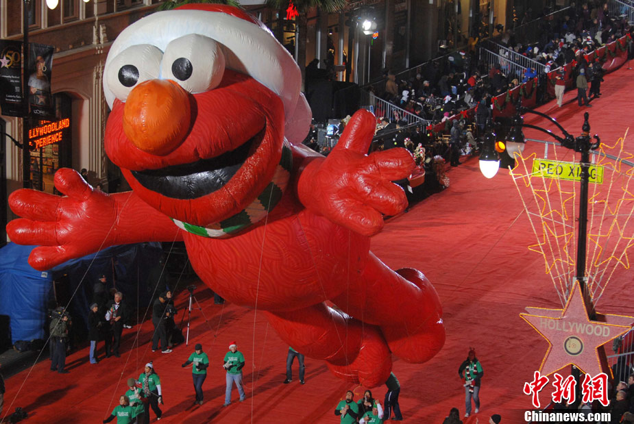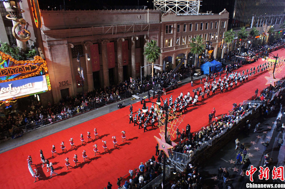 11月28日晚,一年一度的好萊塢迎圣誕大游行在好萊塢大道隆重舉行。CNN王牌主播拉里·金擔(dān)任今年游行的大禮官,在他的率領(lǐng)下,近60名好萊塢明星和14個樂隊、8個騎馬方陣、巨型充氣卡通、花車等游行隊伍依次通過紅地毯,為洛杉磯迎圣誕活動拉開大幕。好萊塢迎圣誕大游行始于1928年,至今已有80多年歷史。中新社發(fā) 張煒 攝