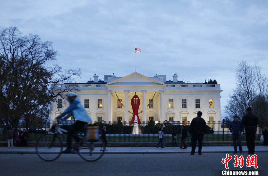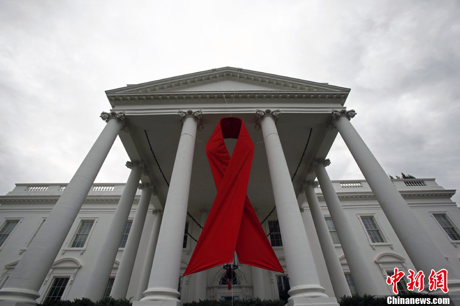 11月30日,為了紀(jì)念世界艾滋病日,華盛頓白宮前掛起了一條巨大的紅絲帶。