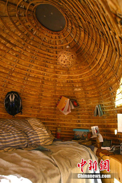近日,來自湖南的24歲青年戴海飛在北京市海淀區(qū)成府路的一個(gè)大院里,搭起一個(gè)“蛋形”小屋,作為自己的蝸居。小屋兩米多高,“蛋殼”上有一個(gè)橢圓形的小門,沒有鎖。小屋的下邊裝有輪子,可以挪動(dòng)。小屋引起了多家媒體的高度關(guān)注,2日深夜有大批的記者來到小屋采訪,而戴海飛卻不知因何一直沒有露面,直到深夜11點(diǎn)多,也沒有回到小屋。中新社記者 富田 攝