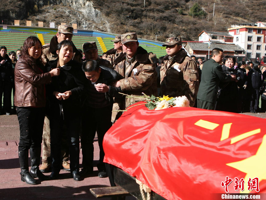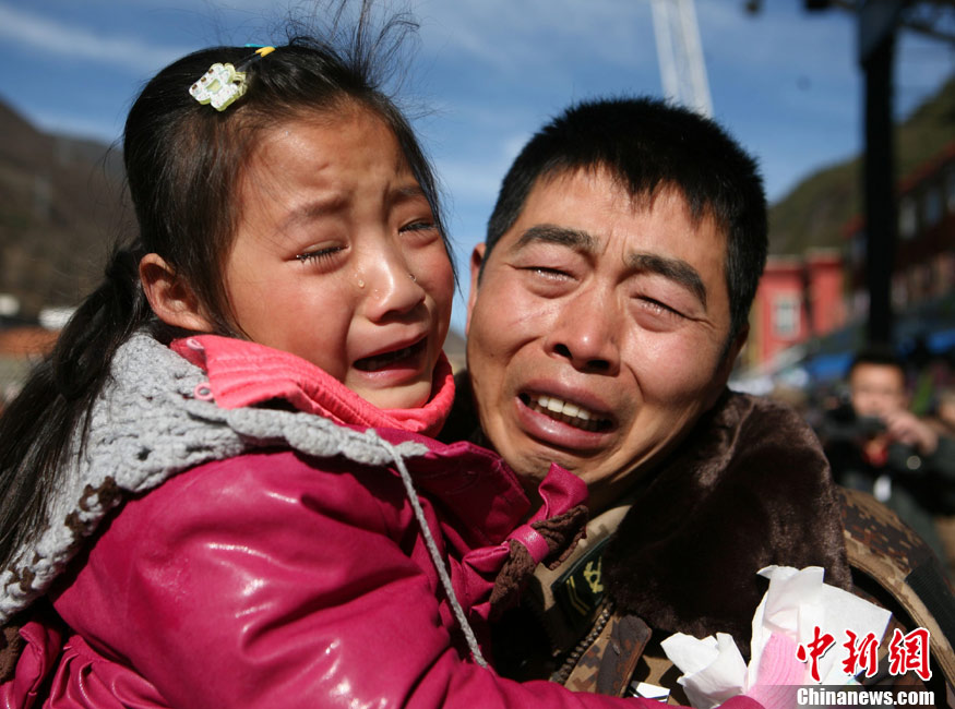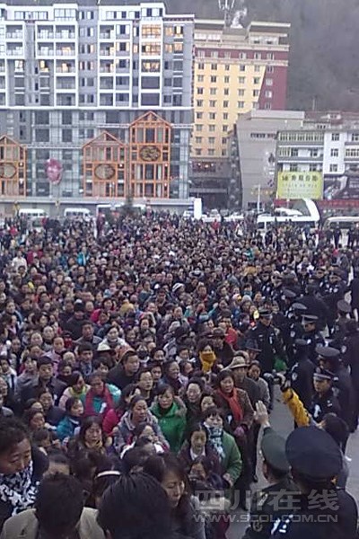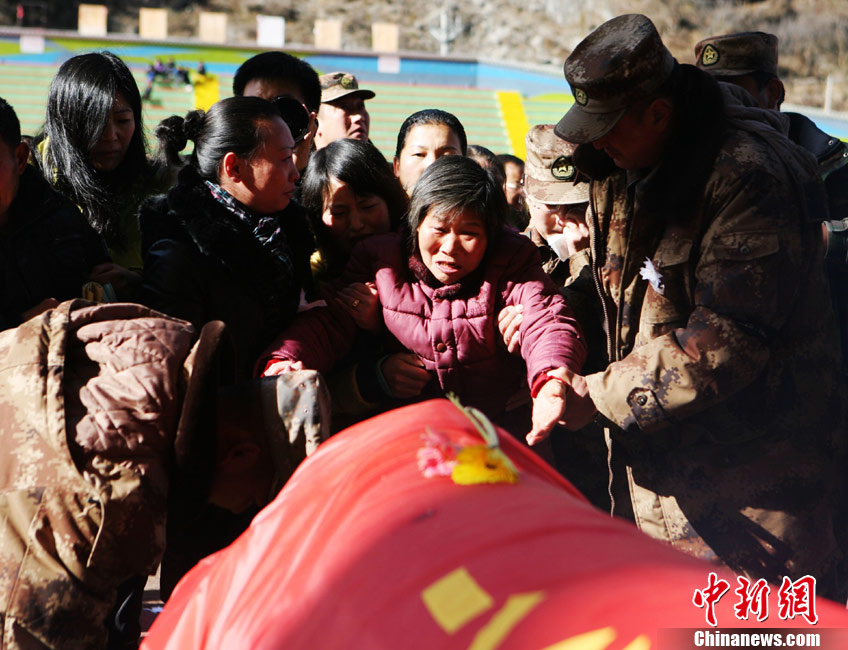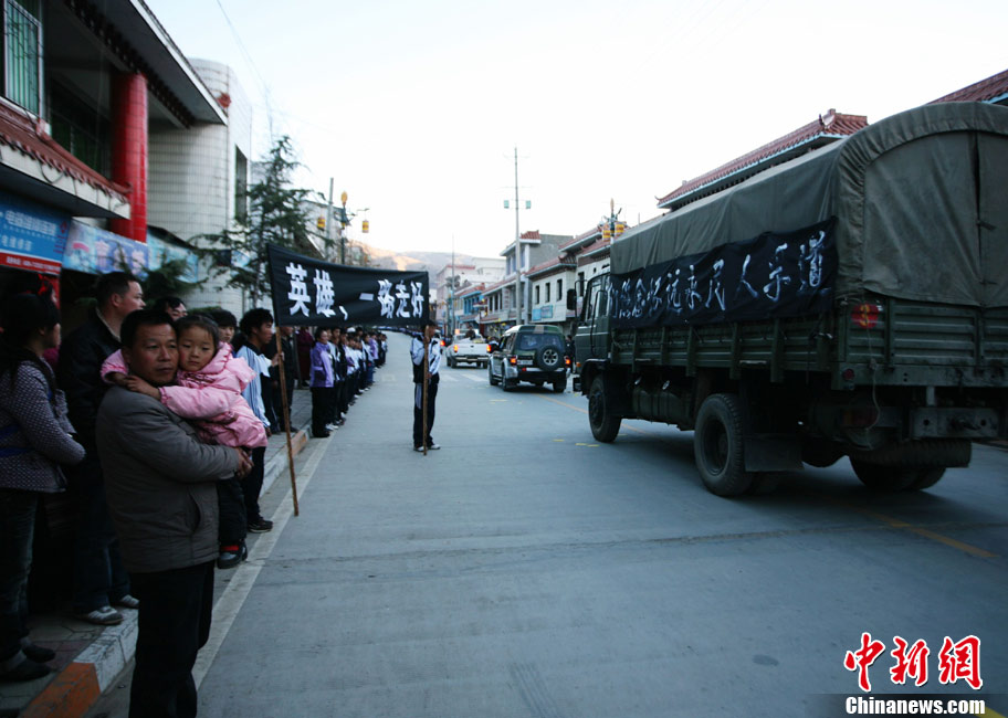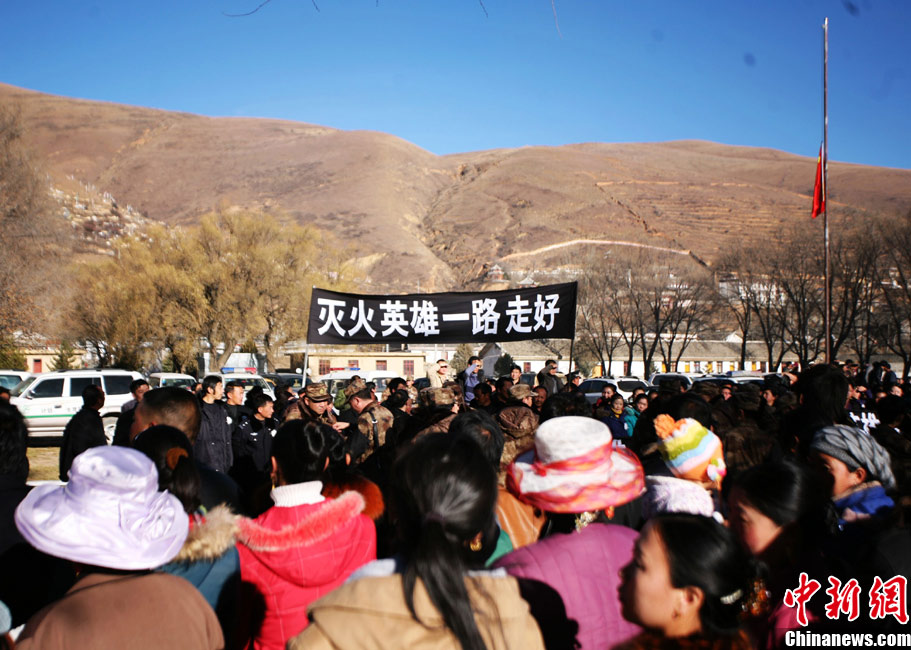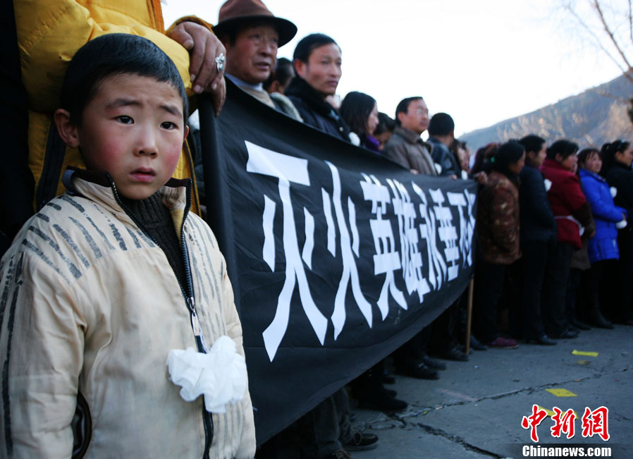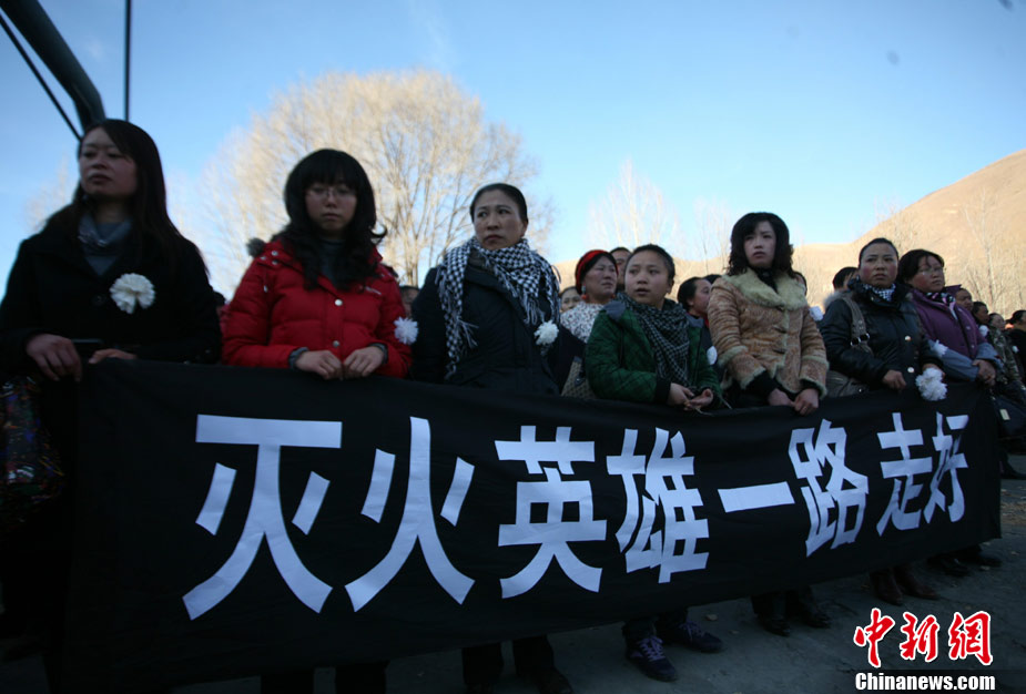 12月6日下午17時,在四川道孚救火中犧牲的15位英雄靈柩起運送往康定火化,上萬民眾胸帶白花來到英雄路過的川藏線國道317線道孚城區(qū)段送別英雄。圖為道孚縣民眾痛別英雄。