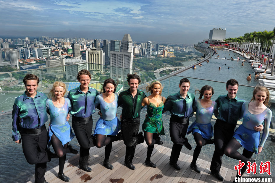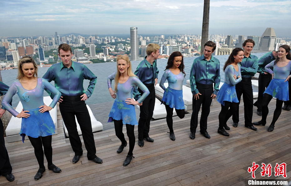 圖為大河之舞愛爾蘭舞蹈團(tuán)成員在新加坡濱海灣金沙酒店的空中花園合影。