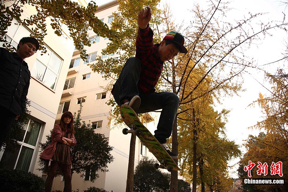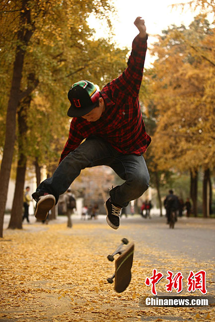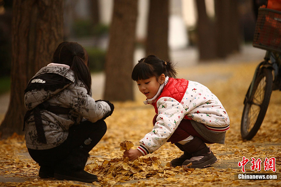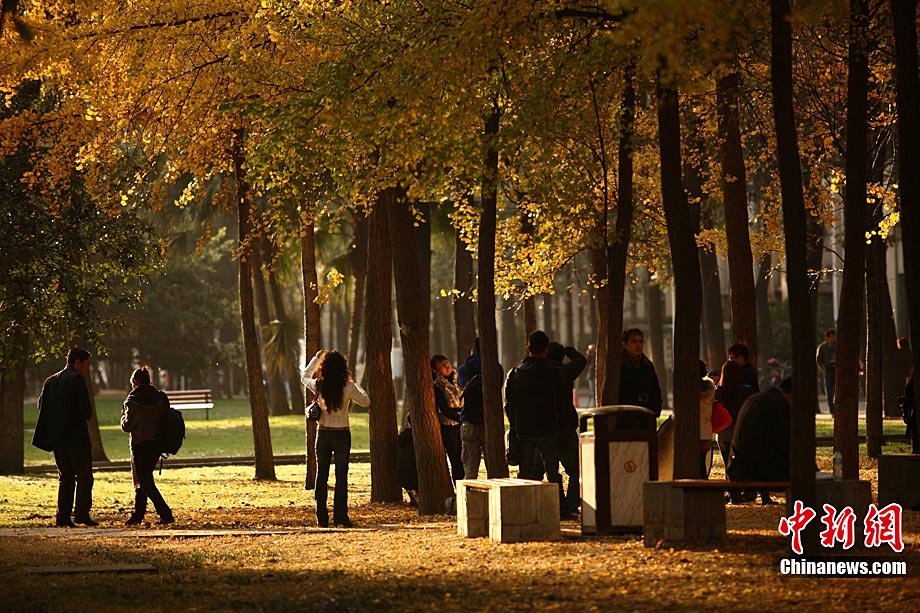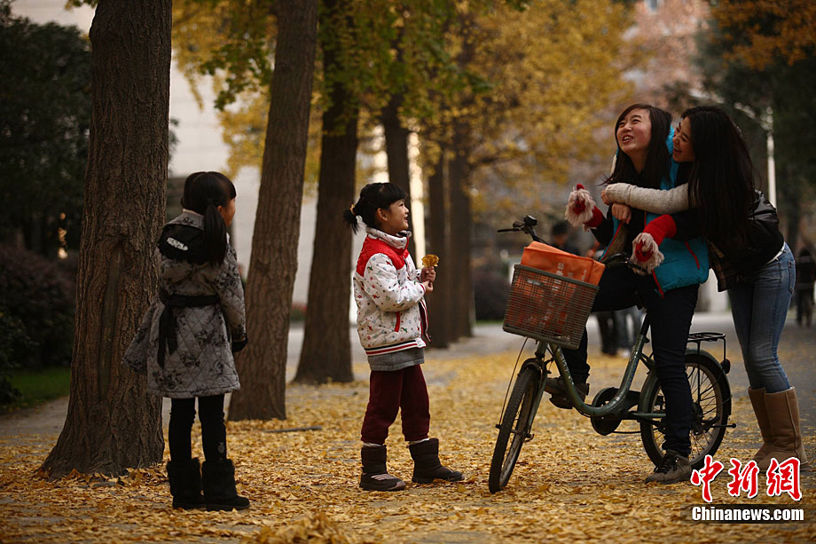 銀杏樹作為成都市的市樹,每年11月底到12月初是市民觀賞銀杏的最佳時期,面對市民發(fā)出的“保留銀杏落葉景觀”呼聲,成都市環(huán)衛(wèi)部門于2009年對部分街道的銀杏落葉首次采取“只撿不掃”的措施,2010年,成都環(huán)衛(wèi)部門繼續(xù)采用了這一人性化措施,將銀杏落葉景觀長時間留給市民。中新社發(fā) 張浪 攝