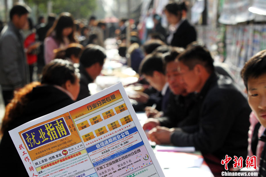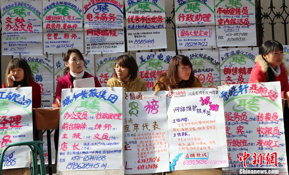 12月11日,年終歲末,在河南省人才市場(chǎng)的馬路上招牌用工者的美女招聘者坐成排等候應(yīng)聘者前來(lái)咨詢。許多企業(yè)反映,每到年底都有部分員工請(qǐng)假回家相親結(jié)婚或與家人團(tuán)聚過(guò)年,造成工廠人手不夠。