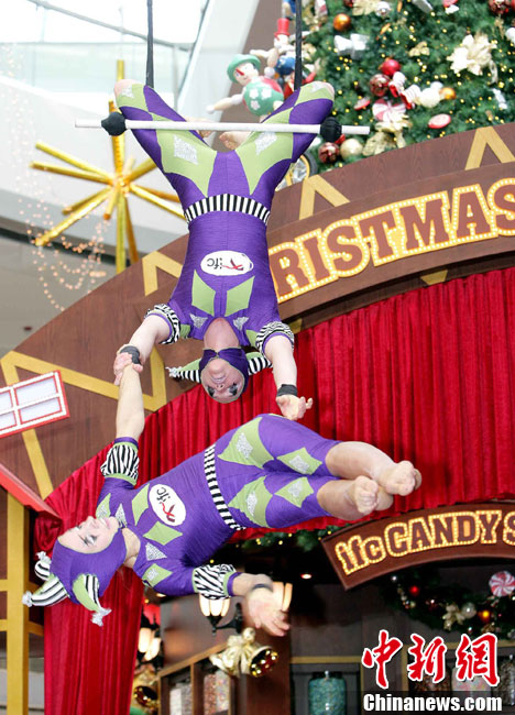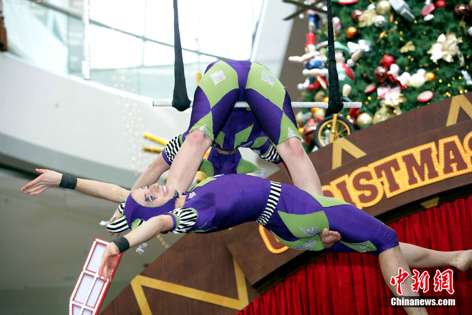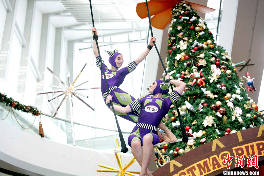 12月14日,香港國(guó)際金融中心上演震撼視覺(jué)的高空特技。首次來(lái)港獻(xiàn)藝的美國(guó)著名雜技團(tuán)D Squared Trapeze在圣誕樂(lè)園內(nèi)打造雙人空中秋千,凌空飛舞表演,帶給觀眾“飛一般”夢(mèng)幻體驗(yàn)。中新社發(fā) 洪少葵 攝
