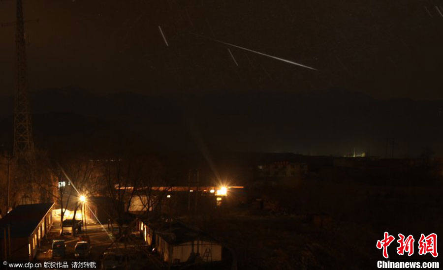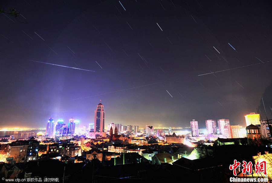 臨近歲末,雙子座流星雨如期而至。12月14日19時(shí),雙子座流星雨達(dá)到極大,每小時(shí)流星量達(dá)120顆。圖為山東青島棧橋景區(qū)上空明亮的流星從雙子星座輻射而出,劃過城市上空。周昆 攝 圖片來(lái)源:CFP視覺中國(guó)