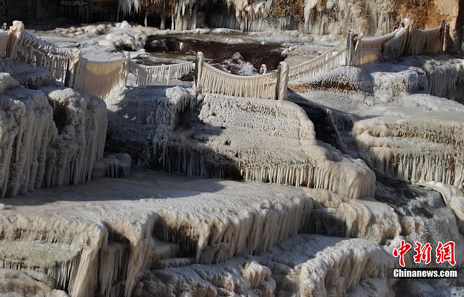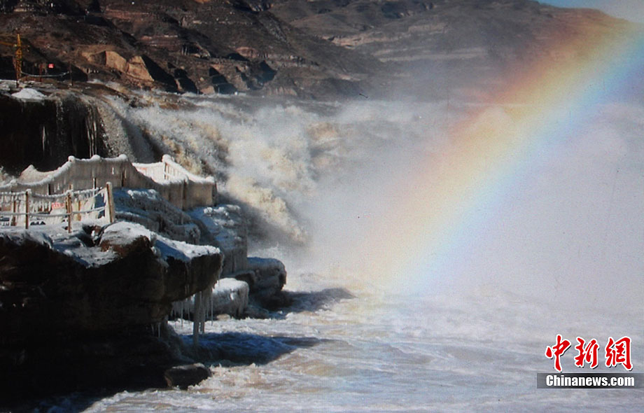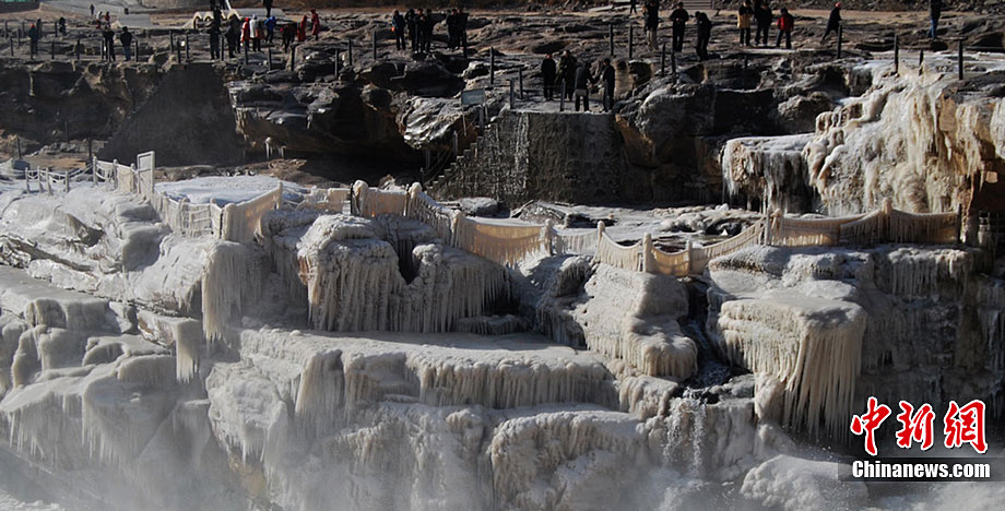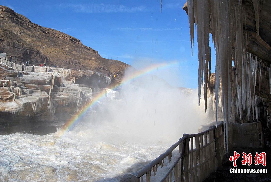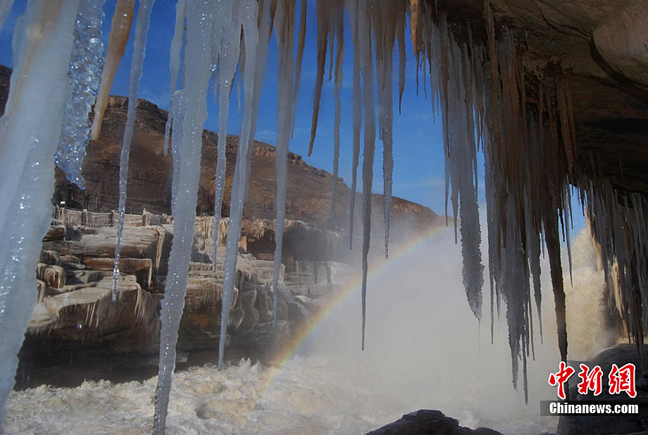 12月15日,受大風(fēng)降溫天氣的影響,黃河壺口段開始大面積流凌。壺口瀑布兩岸的巖石和護欄上也開始凝結(jié)一排排美麗壯觀的冰掛,晶瑩剔透,造型各異,與瀑布中飛舞的彩虹交相輝映,為冬日的壺口瀑布平添了幾分秀色,讓許多游客流連忘返,頻頻舉起手中的相機拍照留念。呂桂明 攝 圖片來源:CNSPHOTO