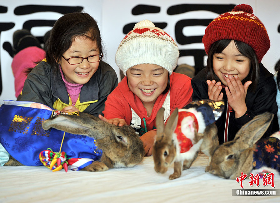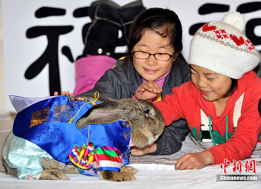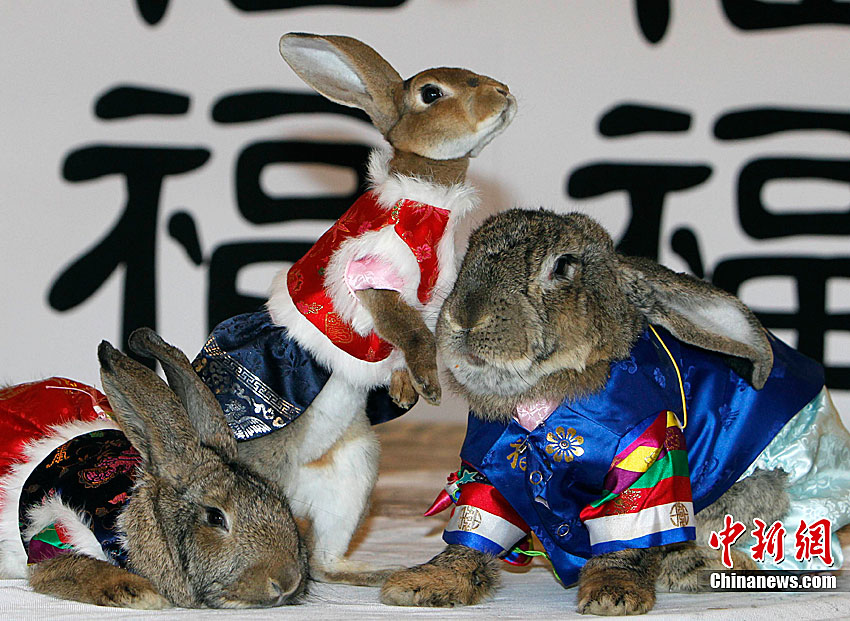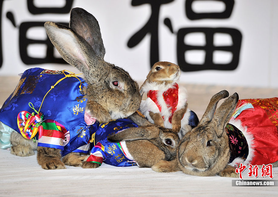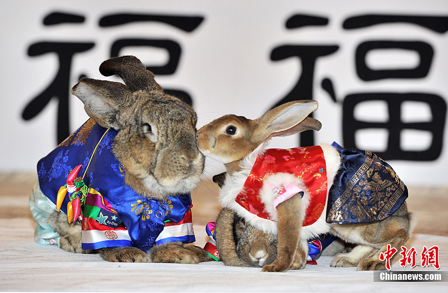 當(dāng)?shù)貢r(shí)間12月16日,位于韓國(guó)京畿道龍仁市的愛寶樂園展出數(shù)只穿著傳統(tǒng)民族服飾“韓服”的兔子,迎接即將到來的兔年。