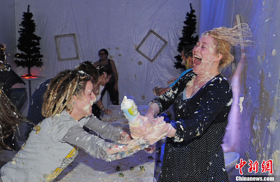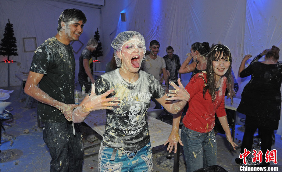 2010年12月18日,人們?cè)谟?guó)倫敦一家畫廊中參加圣誕食物大戰(zhàn)活動(dòng)。在活動(dòng)中人們用甘藍(lán)、土豆泥、果凍及奶油等食品互相“攻擊”,此活動(dòng)的門票收入將捐獻(xiàn)給慈善機(jī)構(gòu)。