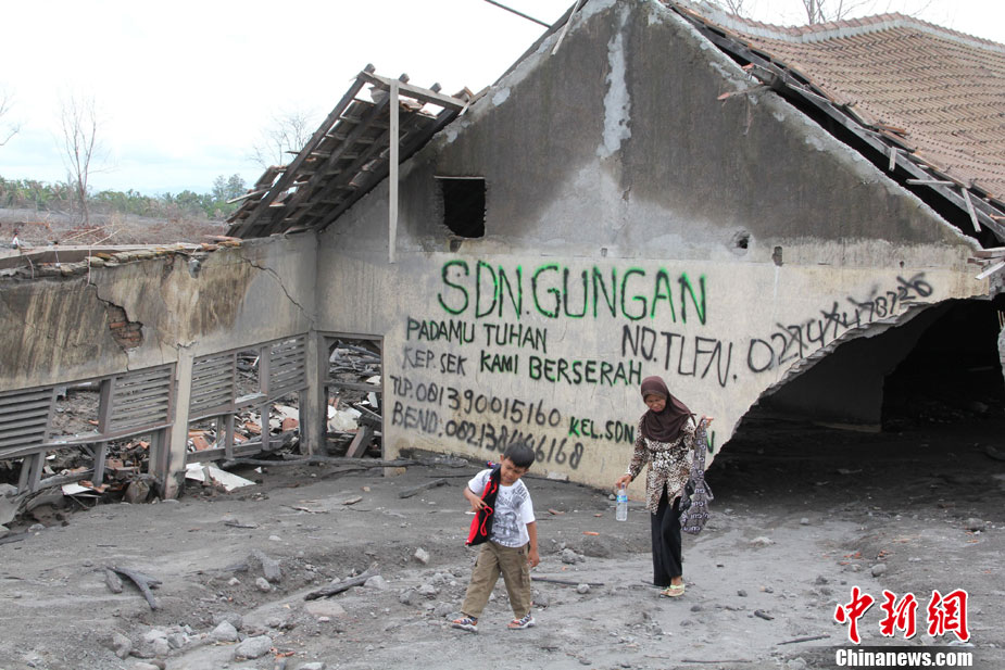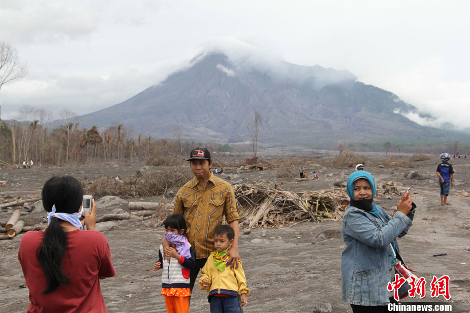 今年10月下旬,位于印尼日惹市的默拉皮火山在沉睡百年后,再次大規(guī)模數(shù)次噴發(fā),并造成300多人罹難、成千上萬人受傷,數(shù)十萬人撤離家園。默拉皮火山11月份停止噴發(fā)后,來自印尼各地的民眾紛紛來此旅游觀光;鹕侥_下一個(gè)叫GUNGAND被火山巖漿埋沒的村莊,每天來旅游的人數(shù)逾5000人。圖為當(dāng)?shù)孛癖娫谂恼樟裟睢V行律绨l(fā) 顧時(shí)宏 攝
