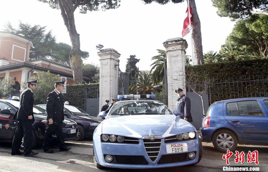 瑞士駐意大利使館一名職員當(dāng)天在拆開(kāi)一個(gè)郵包時(shí),郵包發(fā)生爆炸,該工作人員雙手嚴(yán)重受傷,目前正在醫(yī)院接受治療。時(shí)隔不久,智利駐意大利使館也發(fā)生郵包爆炸事件,一名工作人員受傷,所幸沒(méi)有生命危險(xiǎn)。圖為在智利大使館前警方拉起了警戒線。
