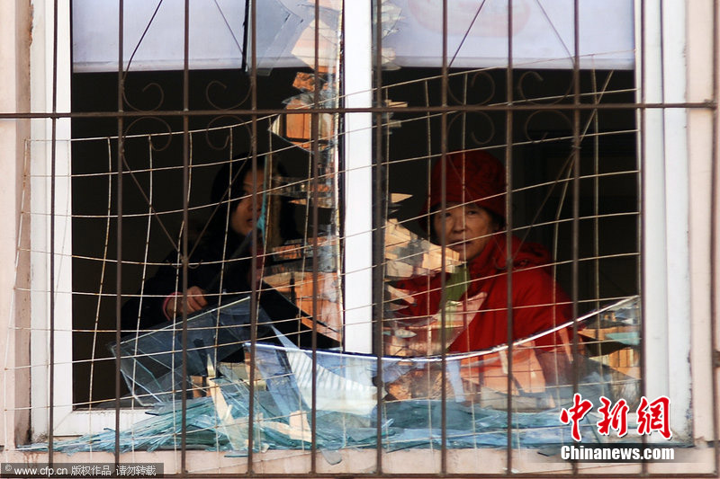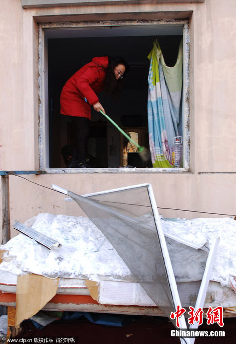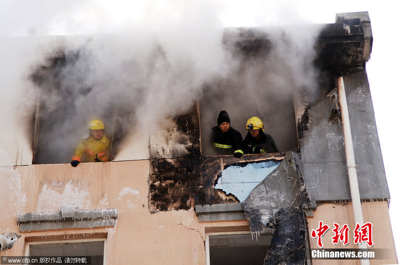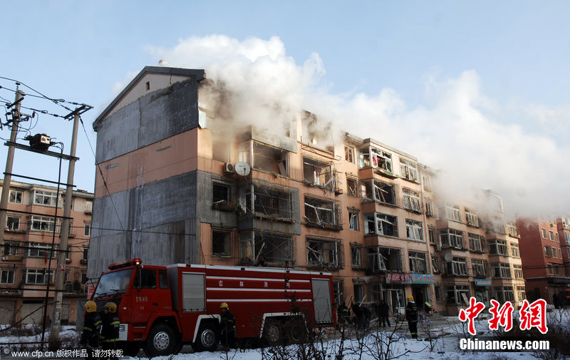 2010年12月24日早,吉林市徐州路附近一住宅小區(qū)發(fā)生天然氣爆炸。據(jù)悉,爆炸波及6棟居民樓,約千余居民轉(zhuǎn)移,有幾名重傷者已送往醫(yī)院,具體傷亡情況正在統(tǒng)計中。圖為爆炸樓房濃煙滾滾,消防官兵進入樓內(nèi)探查情況。圖片來源:CFP視覺中國