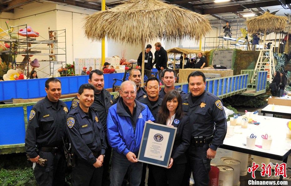 美國一家寵物食品公司推出的新年花車12月29日獲得吉尼斯認(rèn)證,成為世界上最重的單體花車;ㄜ嚳傊剡_(dá)到35噸,其中包括約15噸水。這輛花車將參加2011年元旦舉行的第122屆美國玫瑰花車大游行,屆時十只寵物狗將在花車上表演沖浪、跳水等高難度動作。圖為寵物狗沖浪彩排。中新社發(fā) 張煒 攝