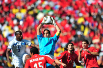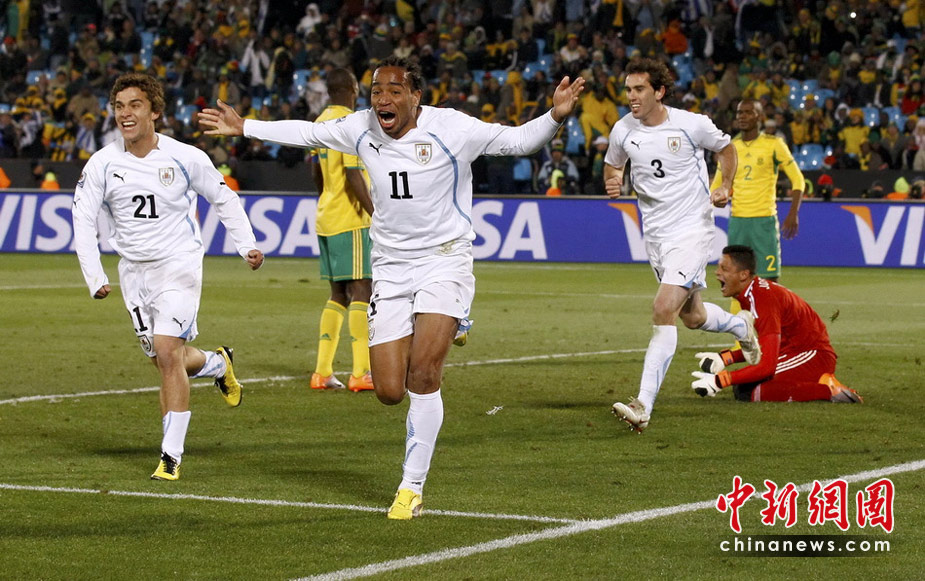 6月17日,世界杯A組第二輪南非迎戰(zhàn)烏拉圭。最終憑借弗蘭的梅開二度和佩雷拉終場(chǎng)補(bǔ)時(shí)的進(jìn)球,烏拉圭隊(duì)以3-0擊敗南非,出線形勢(shì)一片大好。