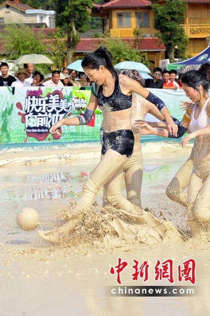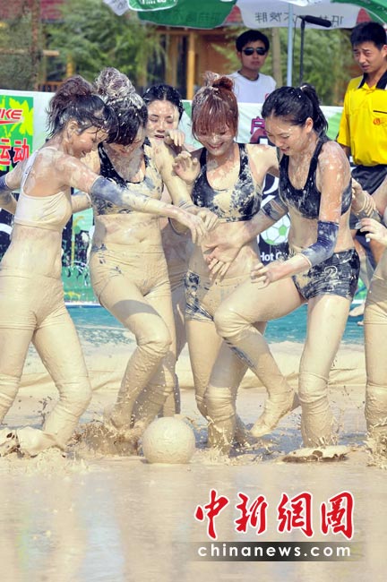南非世界杯戰(zhàn)火越燃越烈,各地的世界杯熱潮也席卷而來。近日,一檔比基尼美女足球賽在長沙開鑼,和世界杯男足不同的是,美女們是在泥漿中比賽。據(jù)悉,這檔名為《快樂美美向前沖》的足球賽已在湖南經(jīng)視播出。節(jié)目中,為了順利闖關(guān),眾美女不顧形象,在泥漿中匍匐前進(jìn)和翻滾,引得觀眾爆笑如雷。圖為首場比賽中,湖南隊(duì)美女與湖北隊(duì)美女在連闖四關(guān)后,進(jìn)入泥漿場內(nèi)進(jìn)行終極球賽PK。湖南經(jīng)視供圖