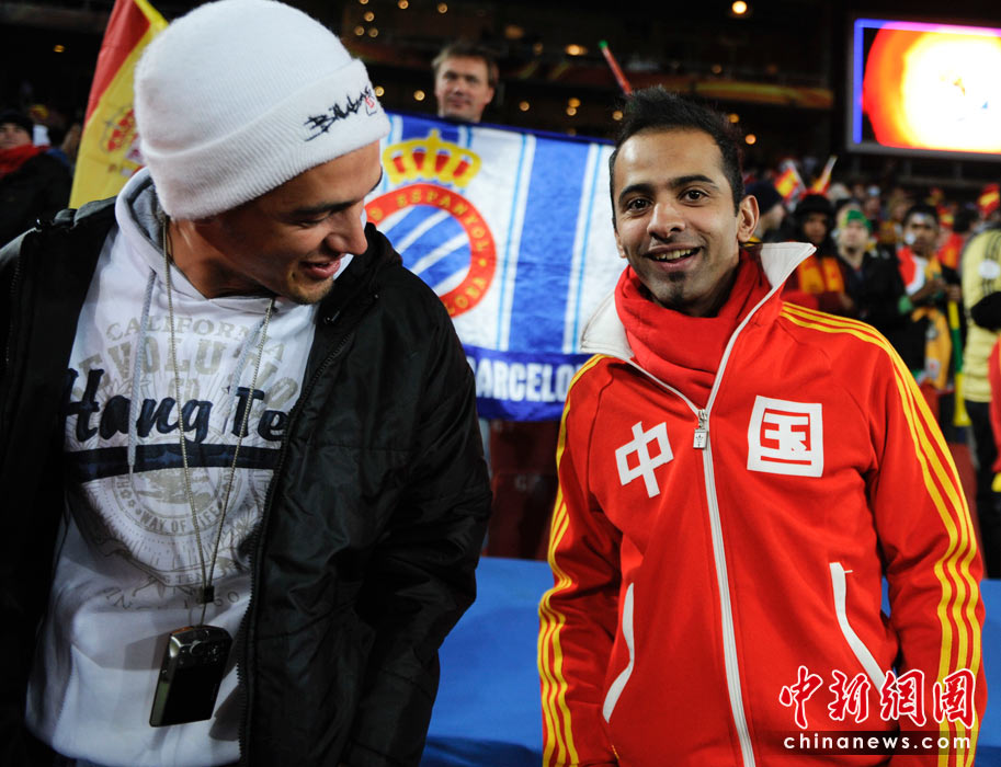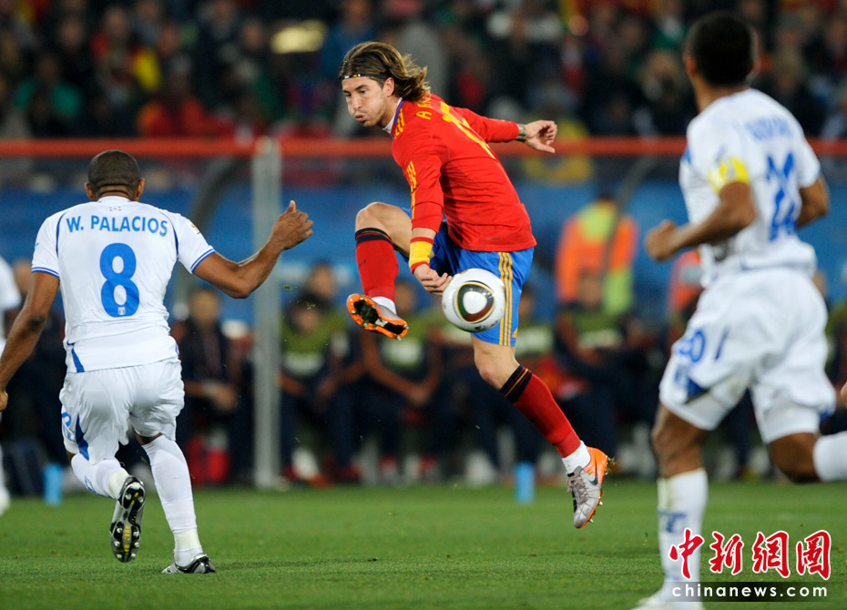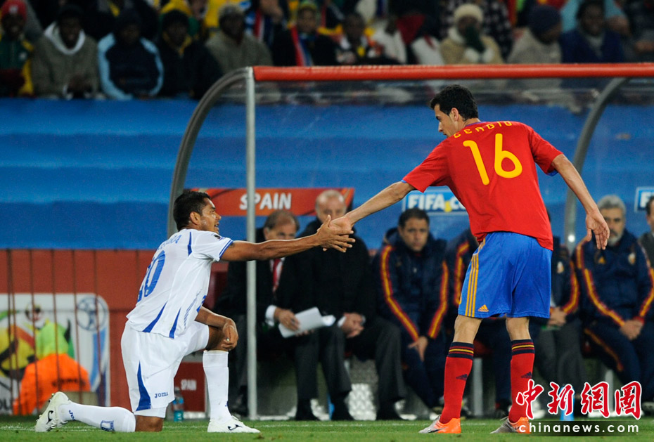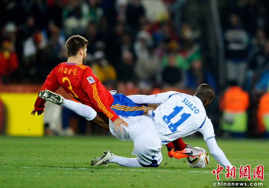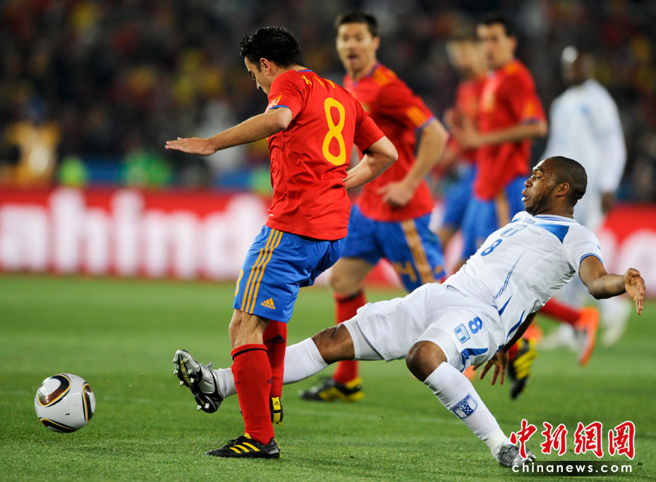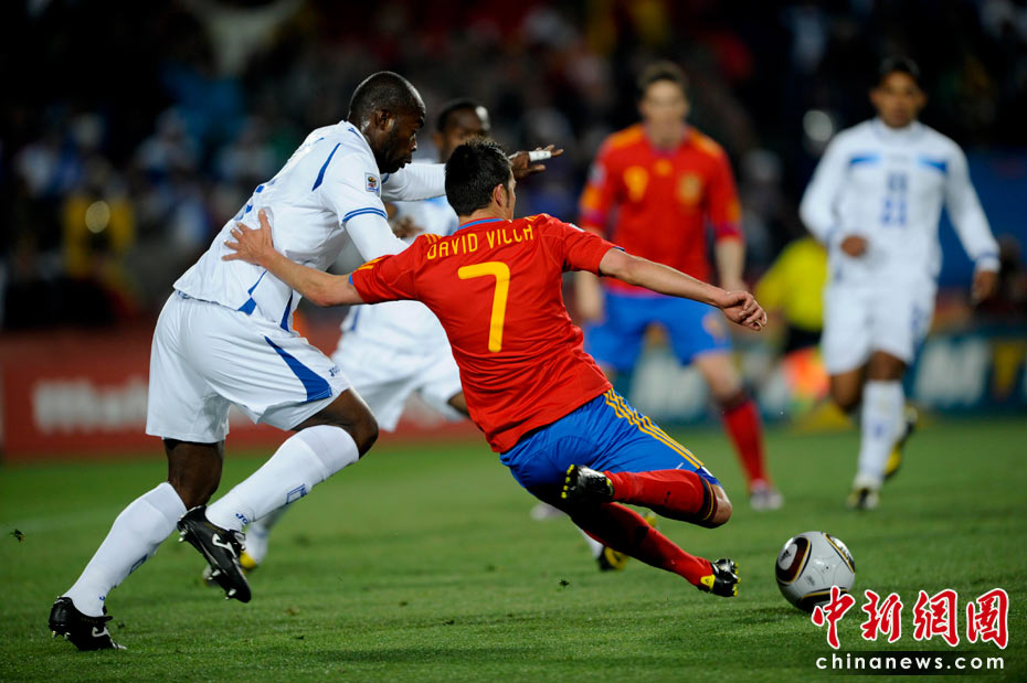 當(dāng)?shù)貢r(shí)間6月21日晚,南非世界杯小組賽第二輪西班牙對(duì)洪都拉斯的比賽在約翰內(nèi)斯堡埃利斯公園體育場(chǎng)展開(kāi)激烈的爭(zhēng)奪,最終西班牙2比0擊敗洪都拉斯 。 中新社記者 廖攀 攝