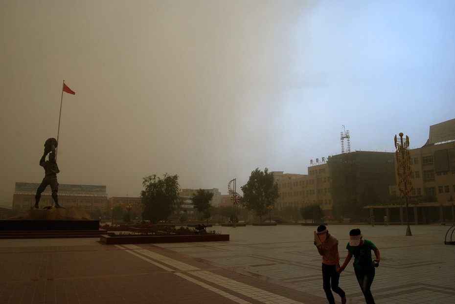 6月27日,甘肅民勤城區(qū)遭到沙塵襲擊。當(dāng)日下午4時左右,甘肅省武威市民勤縣又遭沙塵暴襲擊,黃黑的沙塵迅速籠罩整個縣城,能見度大幅降低。今年4月24日甘肅民勤曾遭特大沙塵暴襲擊。 圖片來源:新華網(wǎng) 李軍 攝