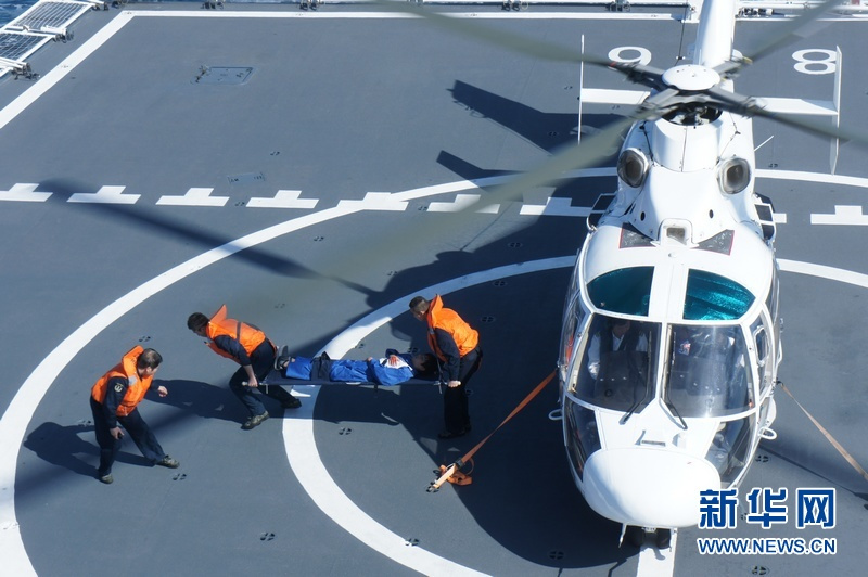 醫(yī)護(hù)人員從直升機(jī)上將“傷員”運(yùn)送至病房。孟彥 攝 圖片來(lái)源:新華網(wǎng)