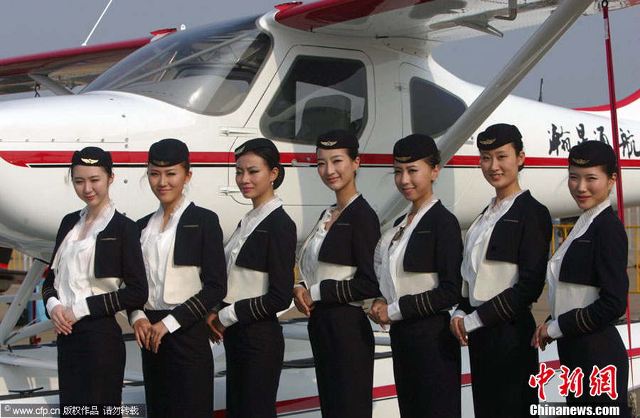 2012年11月13日,廣東省珠海市,瀚星通航的準(zhǔn)女飛行員和飛機(jī)亮相航展。圖片來源:CFP視覺中國
