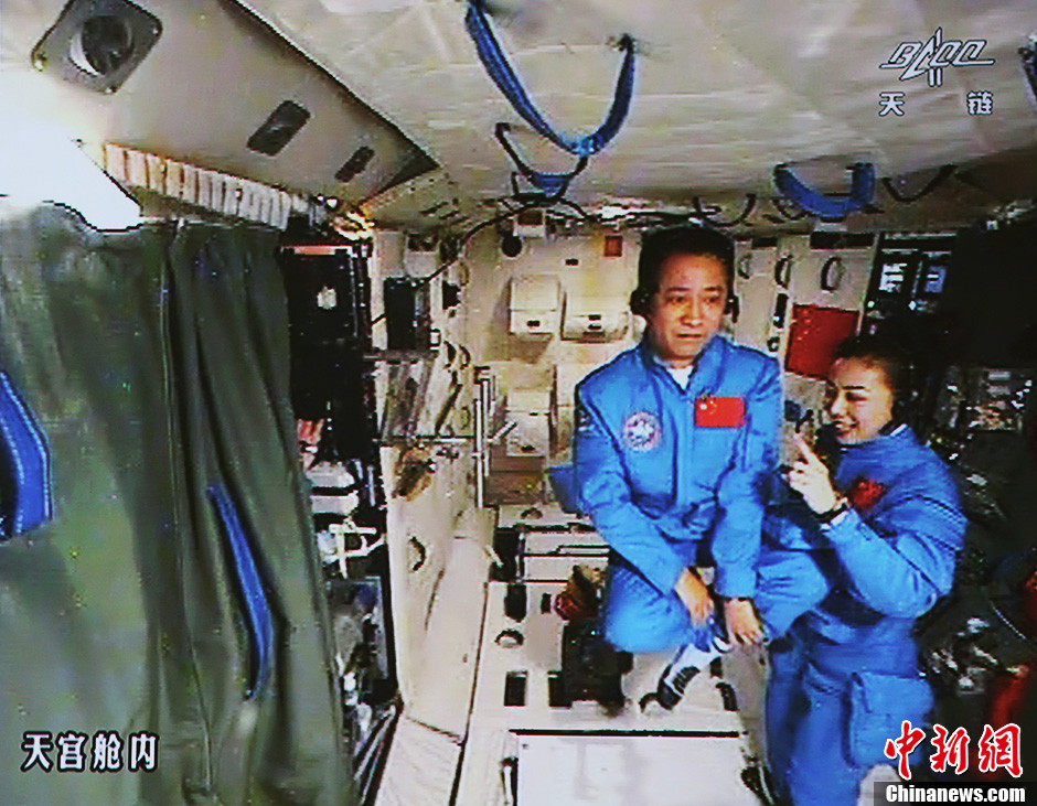 6月20日10時許,神舟十號航天員在天宮一號開展基礎(chǔ)物理實驗,為青少年進(jìn)行中國首次太空授課。圖為講授失重狀態(tài),聶海勝表演“懸空打坐”。中新社發(fā) 秦憲安 攝