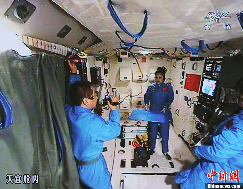 6月20日10時許,神舟十號航天員在天宮一號開展基礎物理實驗,為青少年進行中國首次太空授課。圖為實時畫面。中新社發(fā) 秦憲安 攝