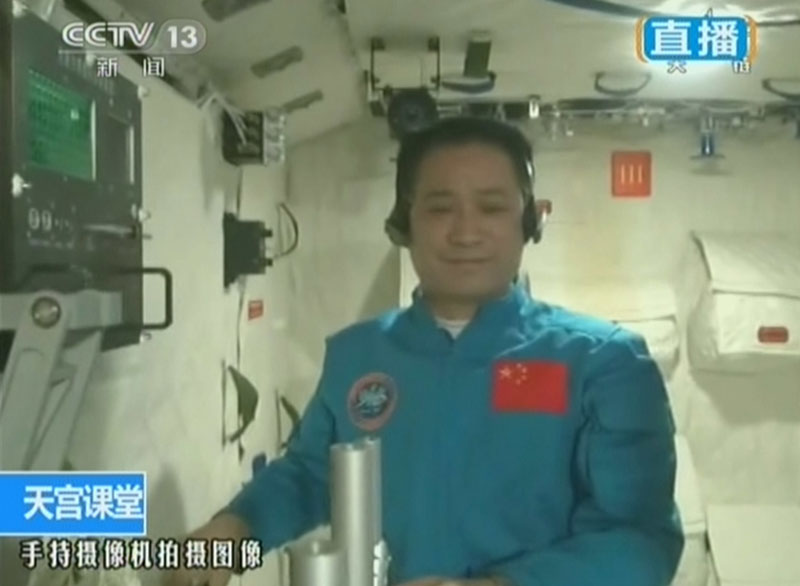 6月20日上午10時(shí)許,神舟十號(hào)航天員進(jìn)行中國(guó)首次太空授課,女航天員王亞平擔(dān)任主講,成為中國(guó)首位“太空教師”。圖為指令長(zhǎng)聶海勝擔(dān)任助教。(視頻截圖)