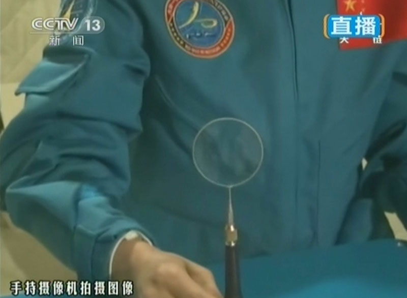 6月20日上午10時許,神舟十號航天員進(jìn)行中國首次太空授課,女航天員王亞平擔(dān)任主講,成為中國首位“太空教師”。圖為王亞平進(jìn)行“水膜”演示。(視頻截圖)